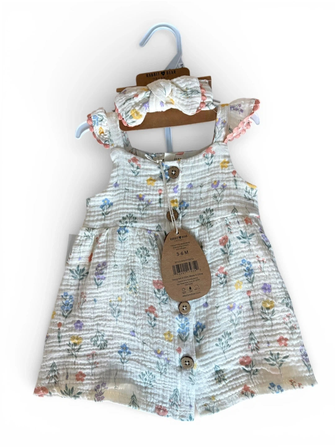 This adorable Rabbit Bear dress and headband set features a lovely floral print fabric. It's size 3-6 months and comes with matching headband. 3 piece set.
