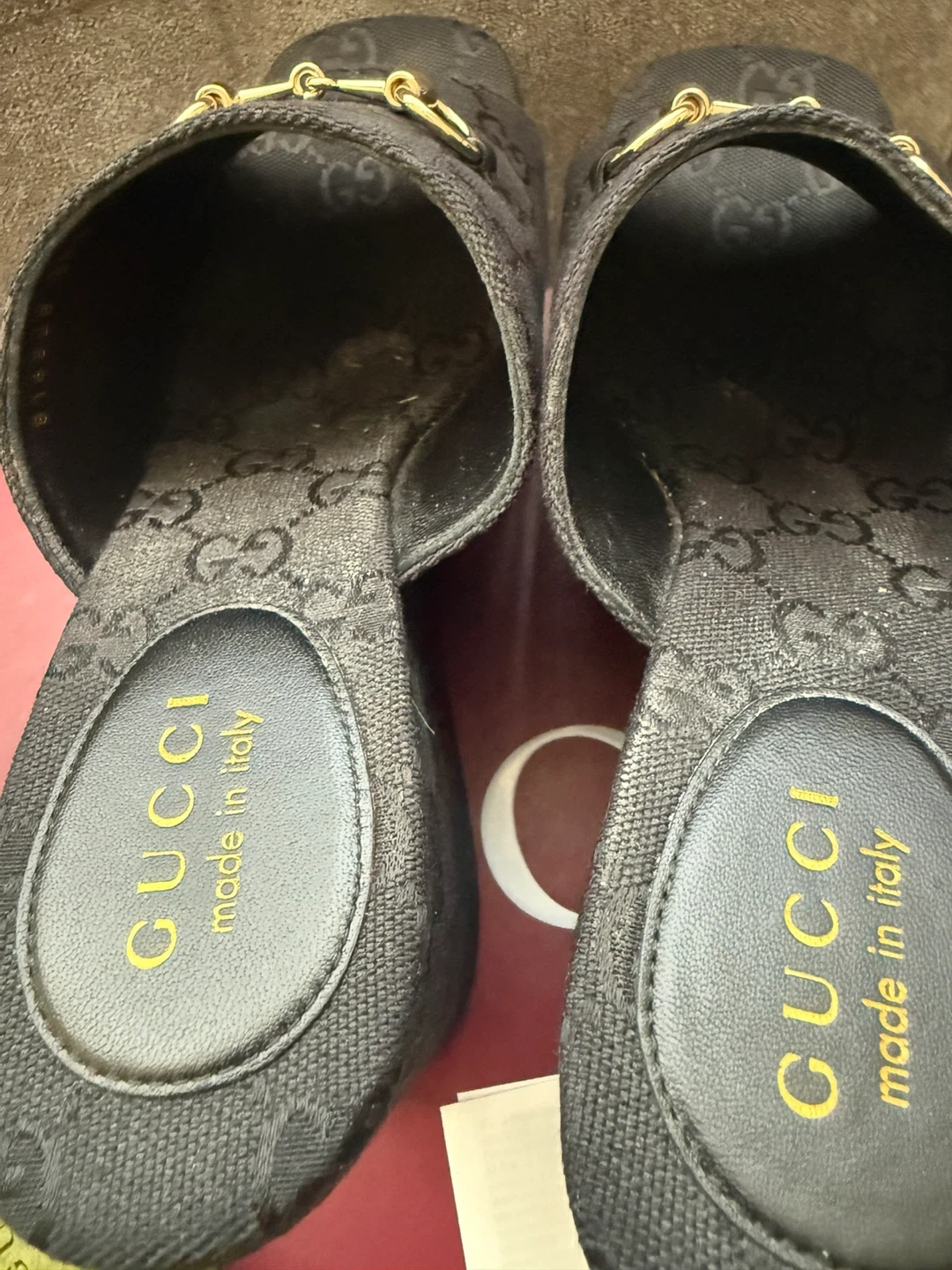 Pre-owned Authentic Gucci black wedge sandals with gold Horsebit.