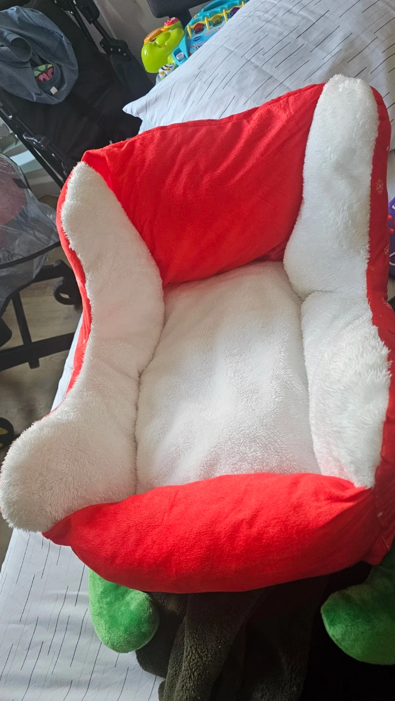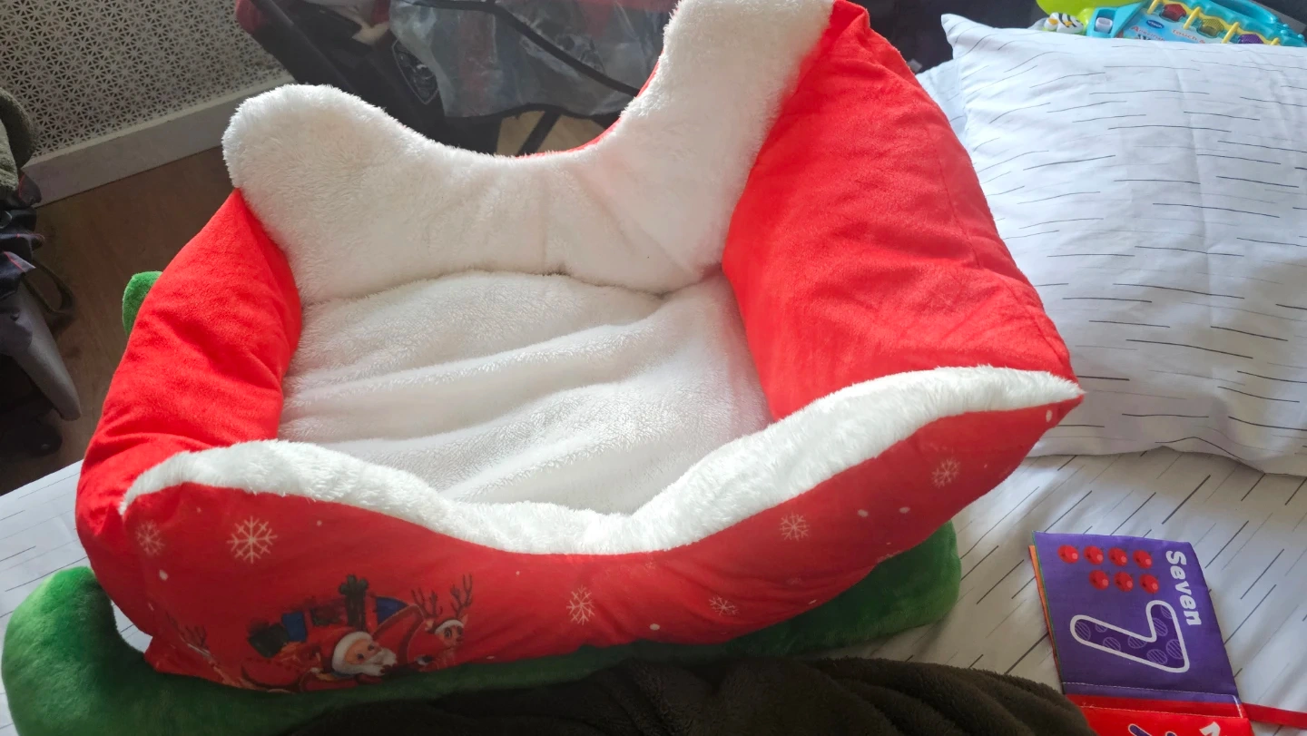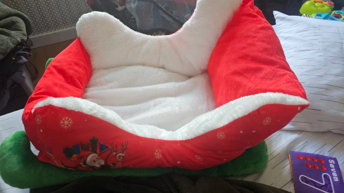 A festive red and white pet bed with a cozy fleece interior. It features a cute Christmas design with Santa and reindeer. This bed is soft and comfortable for your furry friend!