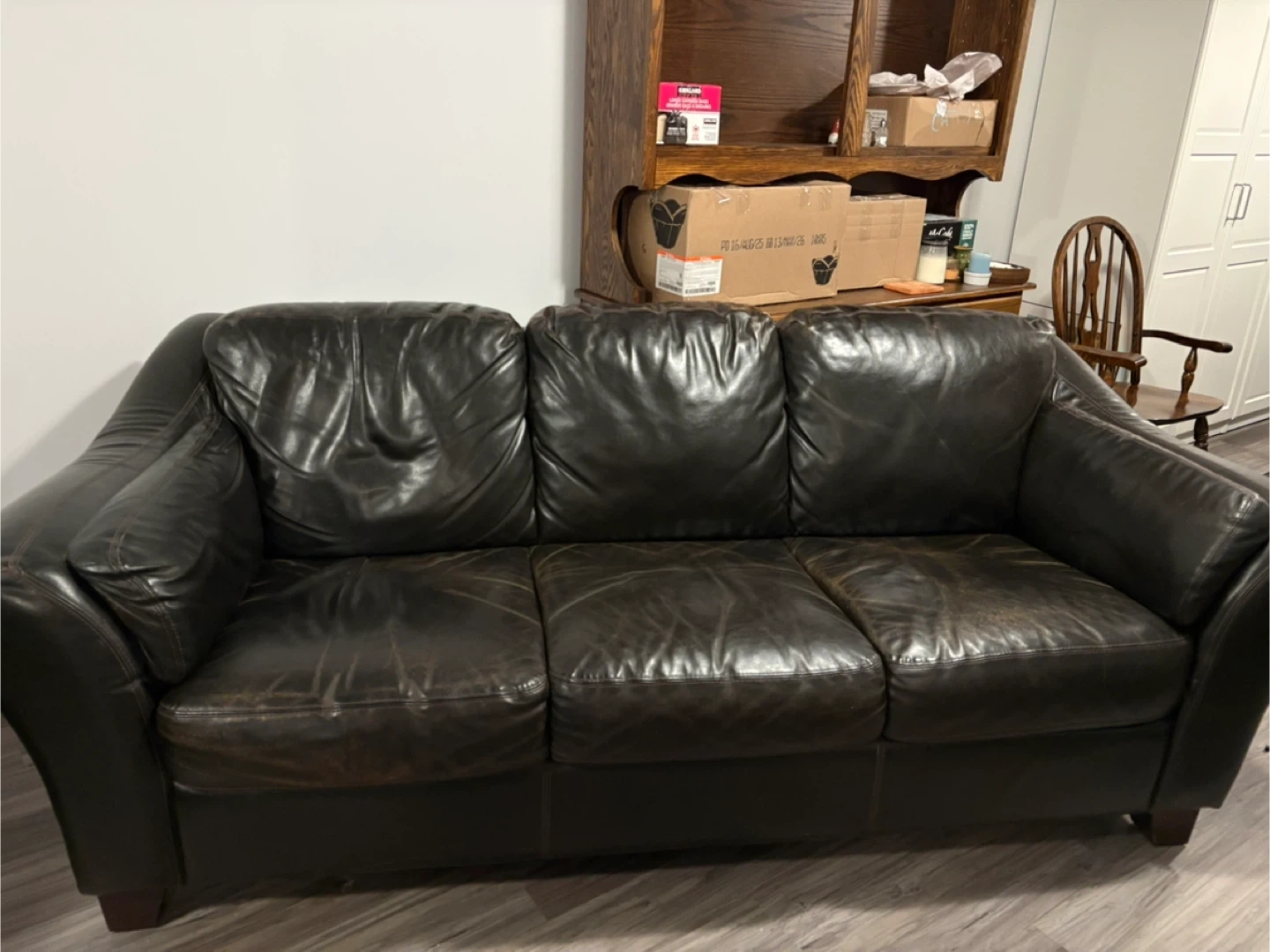 A dark brown leather sofa with three cushioned seats. It's made of leather and purchased at Stoney Creek Furniture. 7 1/2 feet long. Natural wear but NO tears. Must be able to remove from basement family room.