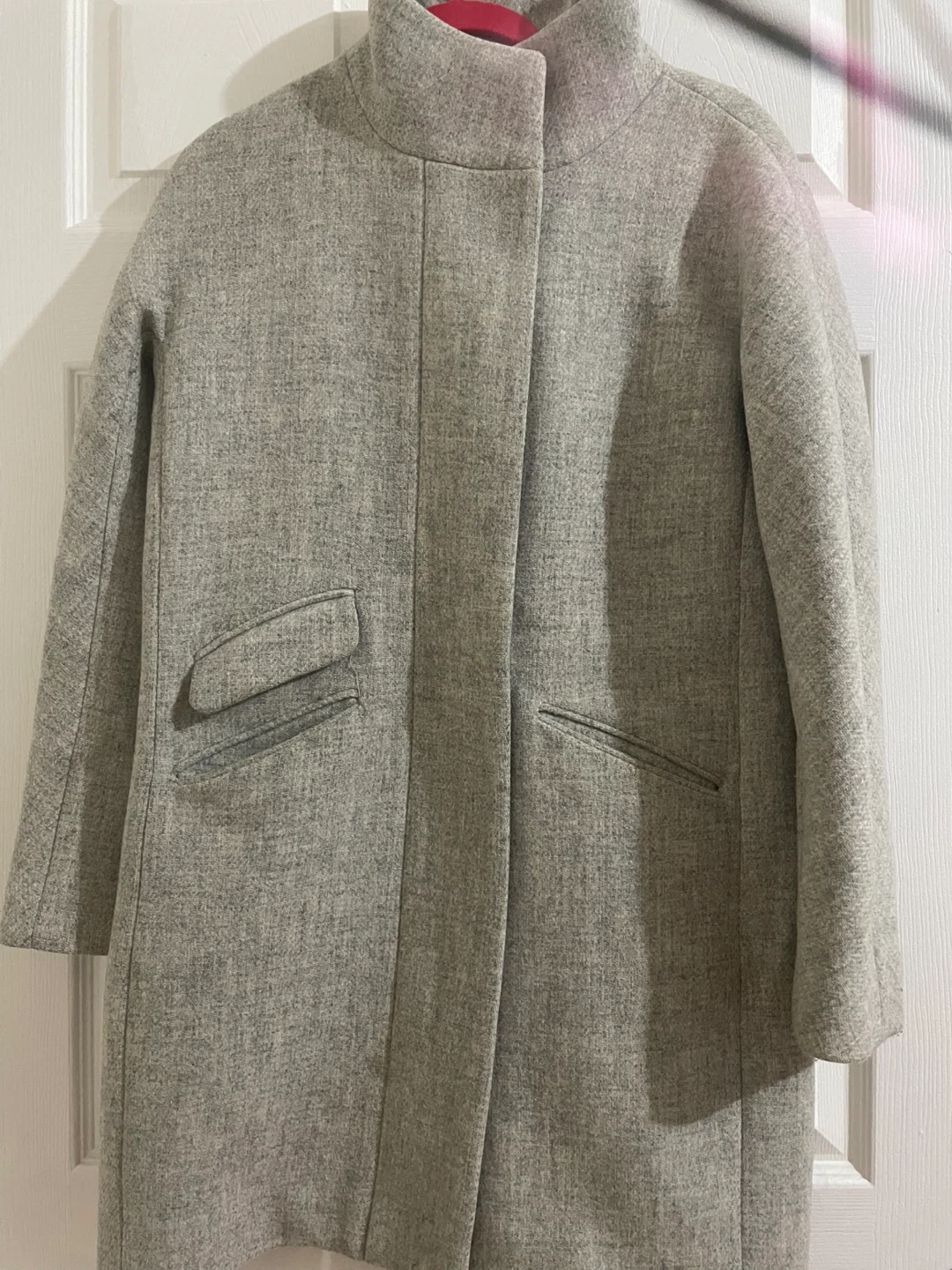 Selling a stylish gray wool coat! It’s in great condition and ready to keep you warm. The material has a nice texture, and it features a unique collar design.