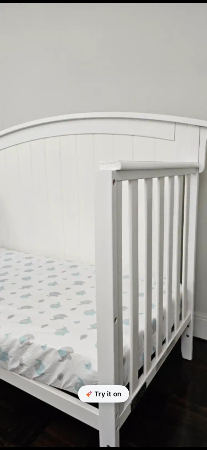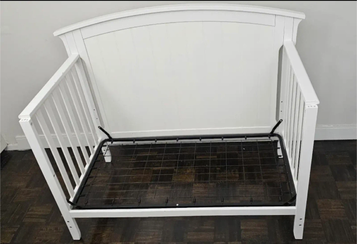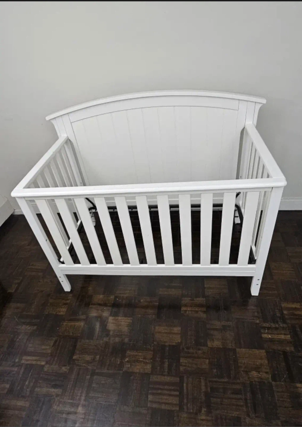 A classic crib in a clean white finish. Features slatted sides and headboard design. Complete with a metal support frame. Can be a perfect spot for baby's naps.