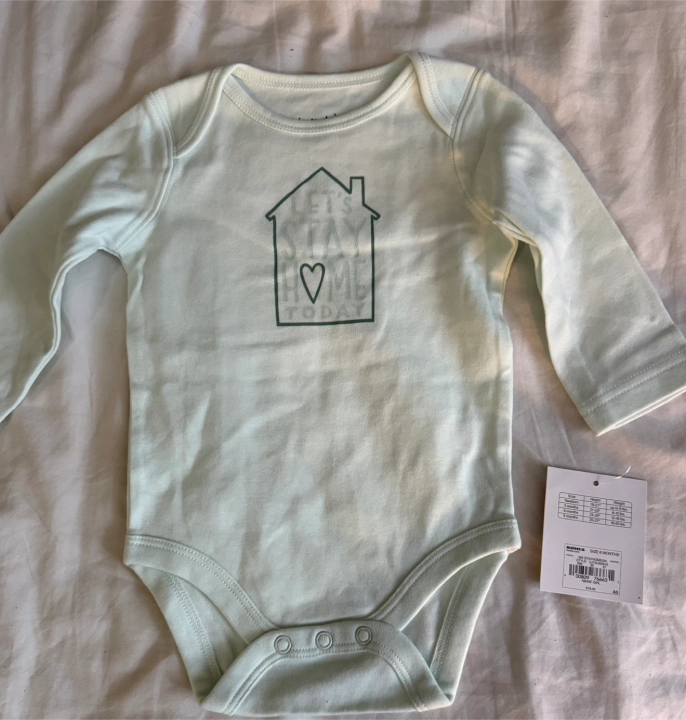 This is a Jumping Beans long-sleeve baby bodysuit. It's a size 6 months. The bodysuit is light green and features a "Let's Stay Home Today" graphic.