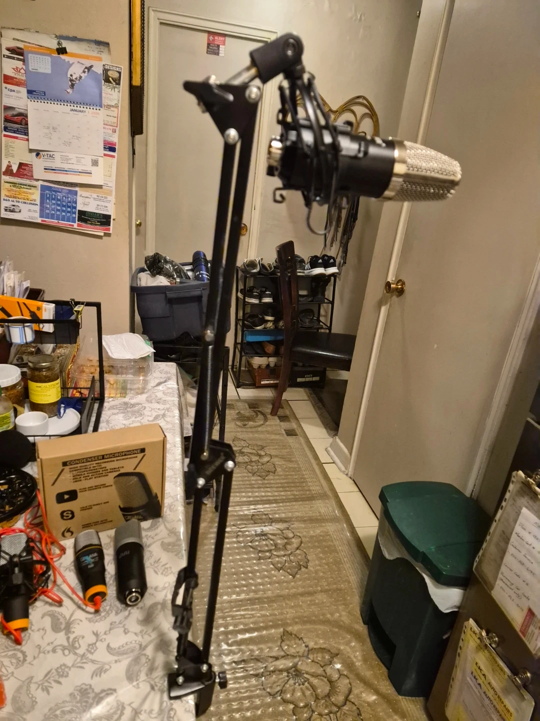 A collection of various microphones, including condenser and dynamic types, along with mounts and cables. This lot features brands like Neewer and Band Professional Microphones. It's a great assortment for aspiring podcasters or home studio setups!
