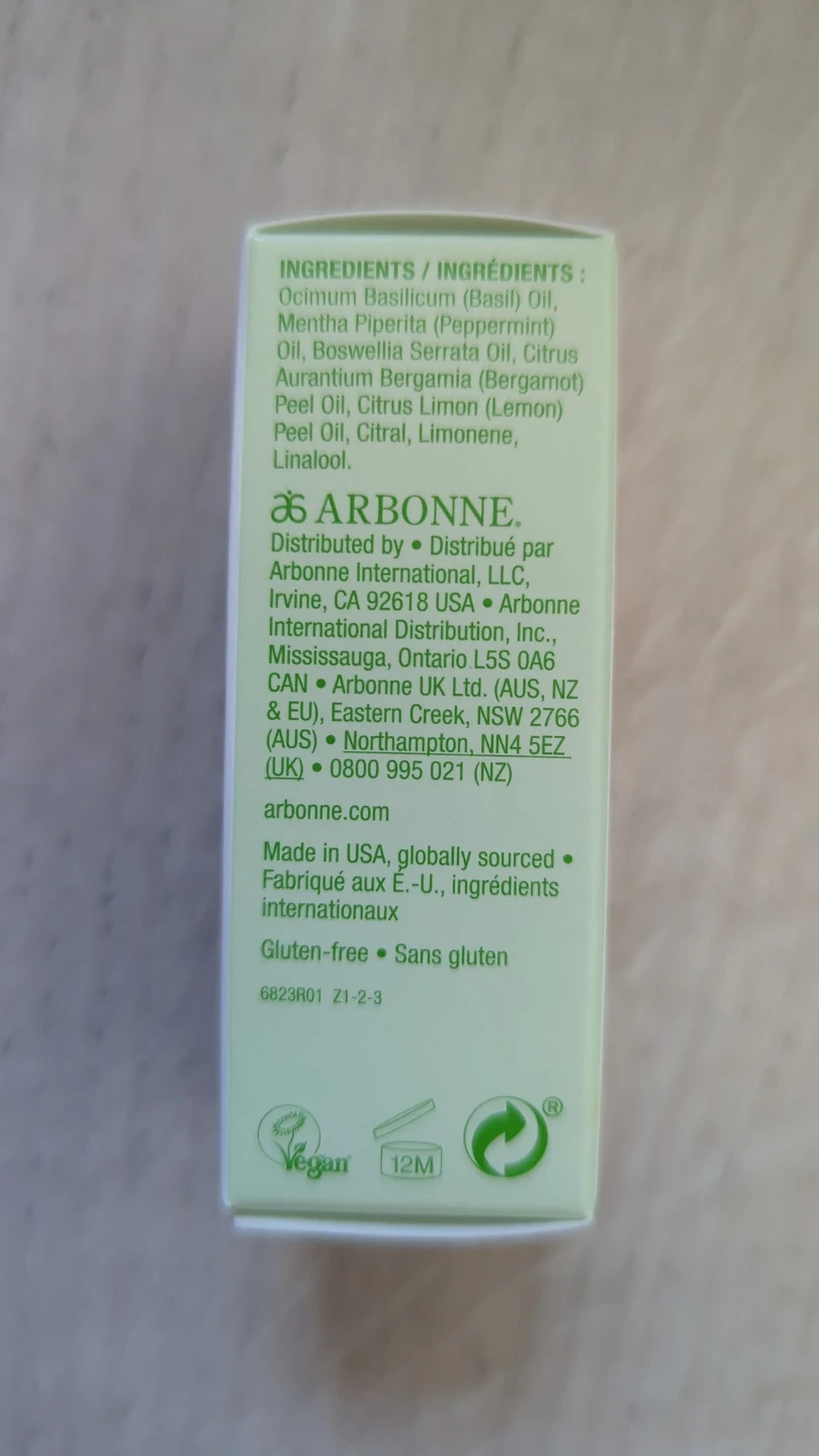 Arbonne Rescue & Renew Pure Essential Oil in a Focus Blend. It's 15 ml. Ingredients include Basil Oil, Peppermint Oil, Bergamot Oil, Lemon Oil, Citral , etc
