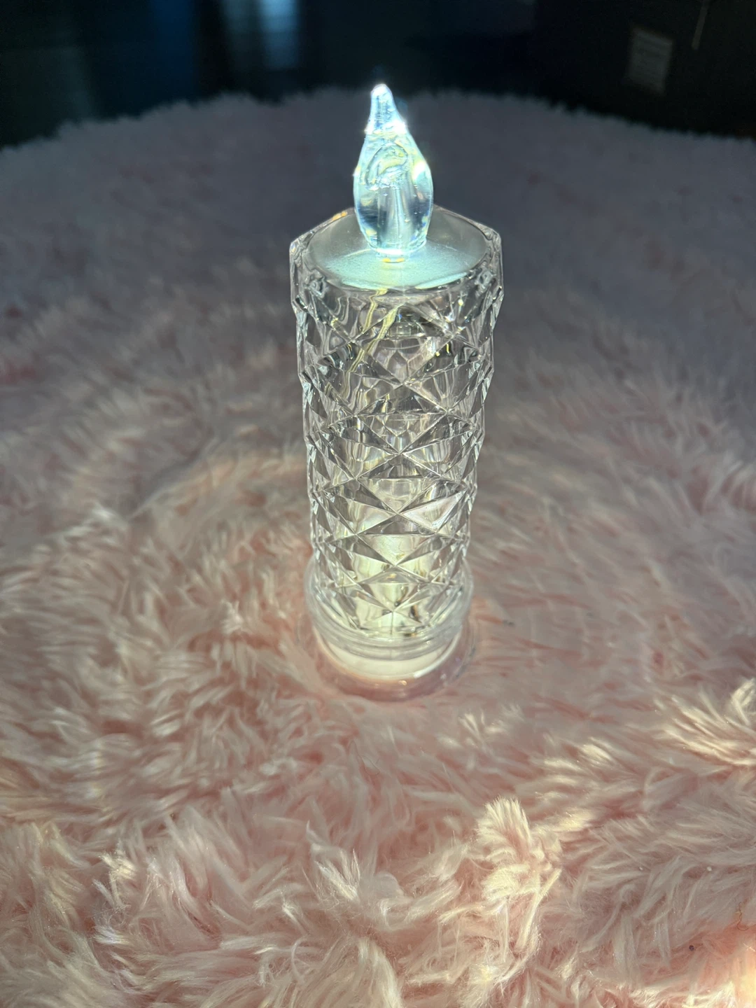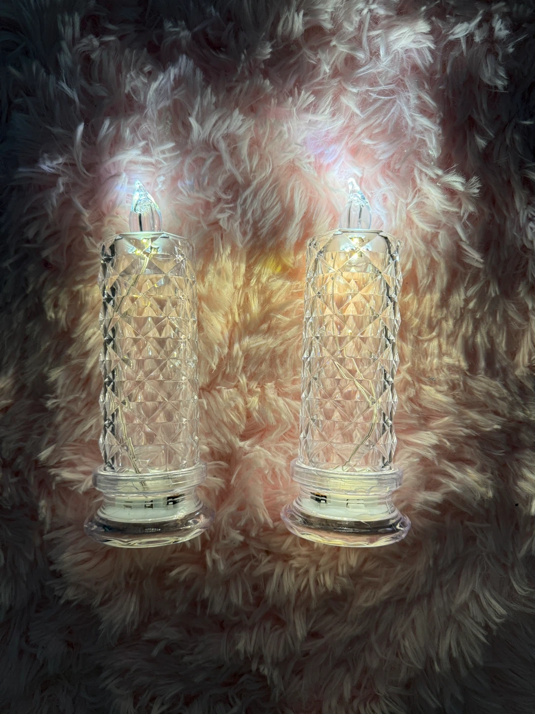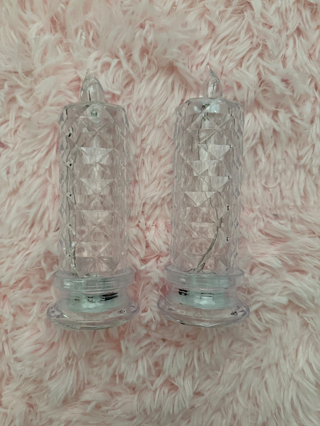 These flameless LED candles come in a set of 16, perfect for creating ambiance. They're made of clear plastic with a diamond-cut pattern and contain small LED lights. Each candle requires batteries for operation. They were perfect for our wedding and they’d be great for parties or holiday decorations!