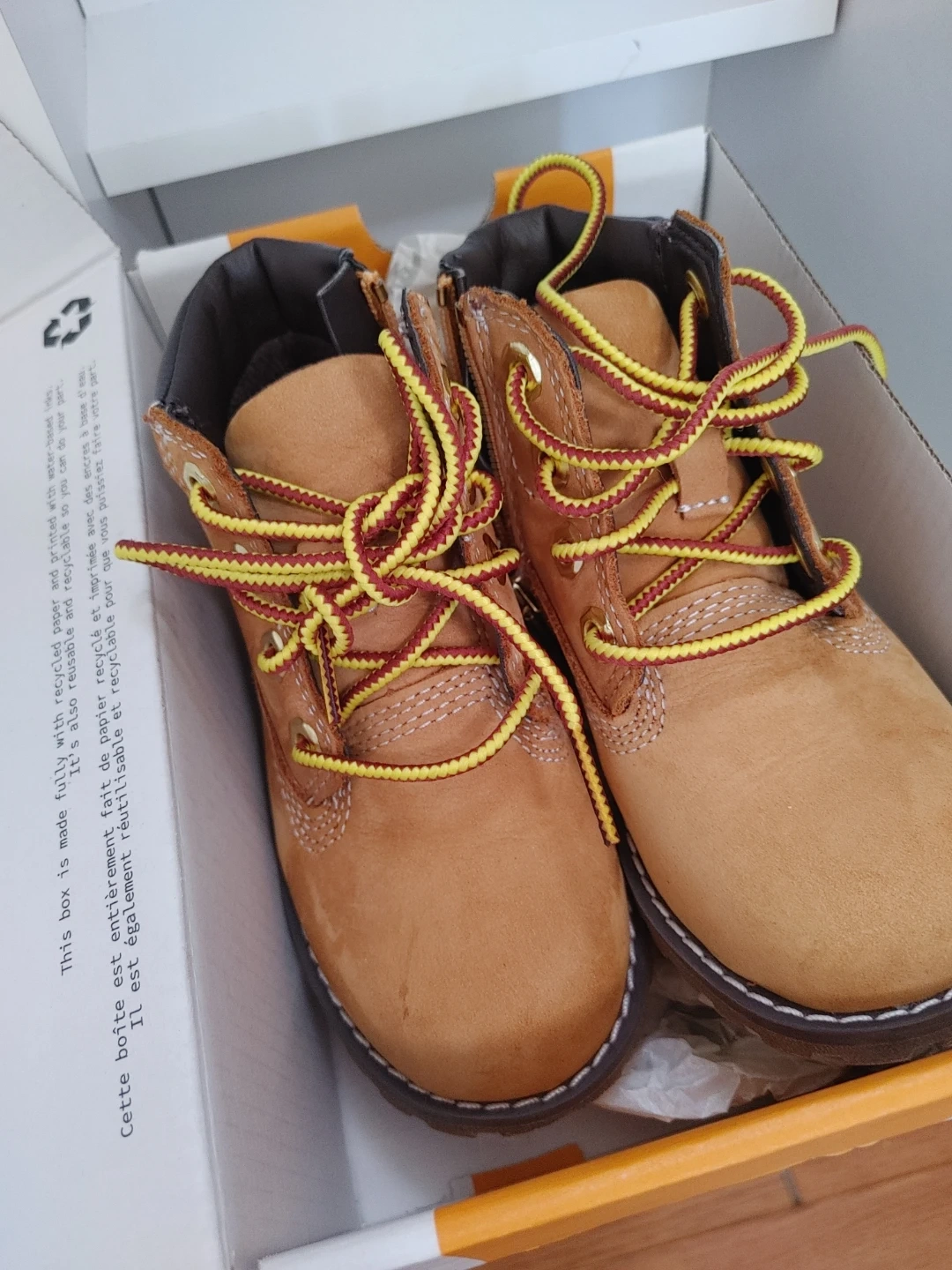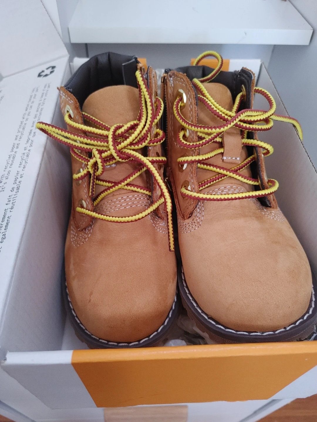 Timberland youth boots in tan nubuck leather with red and yellow laces. These boots have a side zipper for easy on and off. Includes the original box.