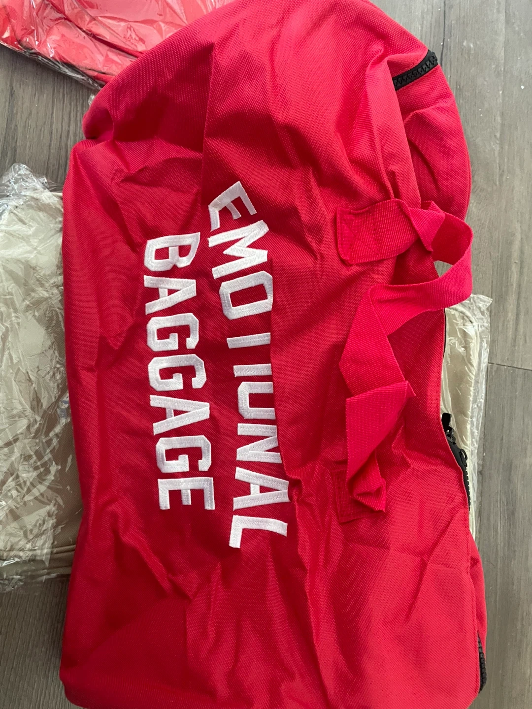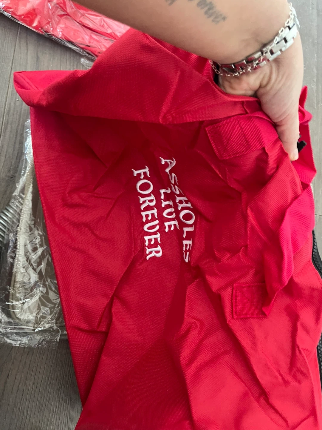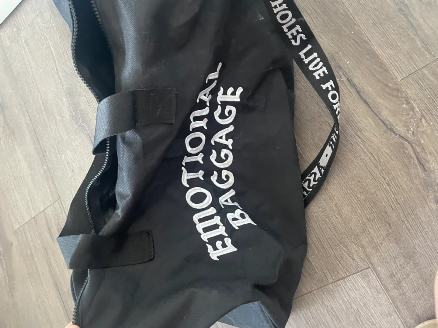 Duffel bag with "Assholes Live Forever" embroidered on it. Also features "Emotional Baggage" text on a black bag. Durable fabric construction. Strap with "Assholes Live Forever" text included.