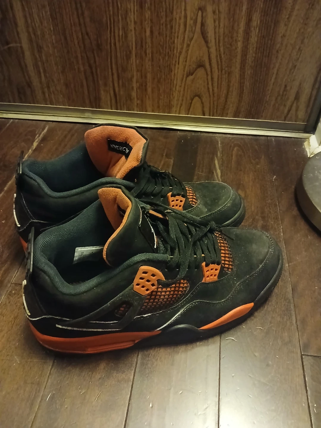 These Air Jordan 4s come in a classic "Bred" colourway. They feature a black suede upper with red and grey accents. This iconic silhouette is a must-have for any sneaker collection.