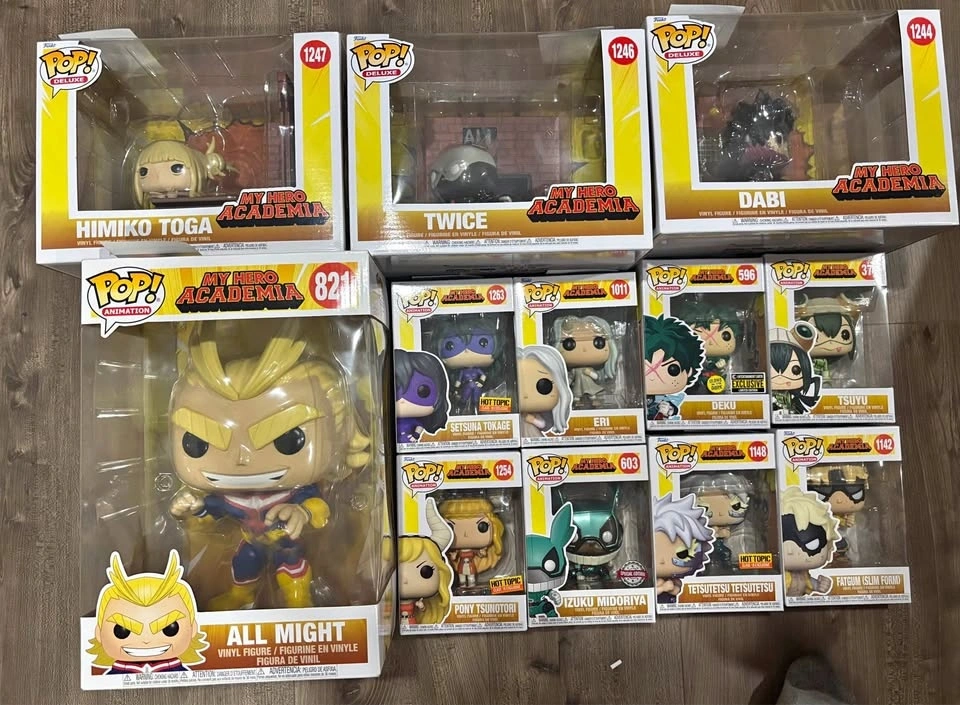 Pick up only. Himiko Toga - $50, Dabi - $35, Twice - $35, 12’ All Might - $35, Setsuna Tokage - $15 (sold), Eri - $15, Deku (glow in the dark) - $20, Tsuyu - $15, Pony Tsunotori (Hot Topic exclusive) - $15, Izuku Midoriya - $15, Tetsutetsu Tetsutetsu (Hot Topic exclusive) - $15, Fatgum (slim form) - $15.