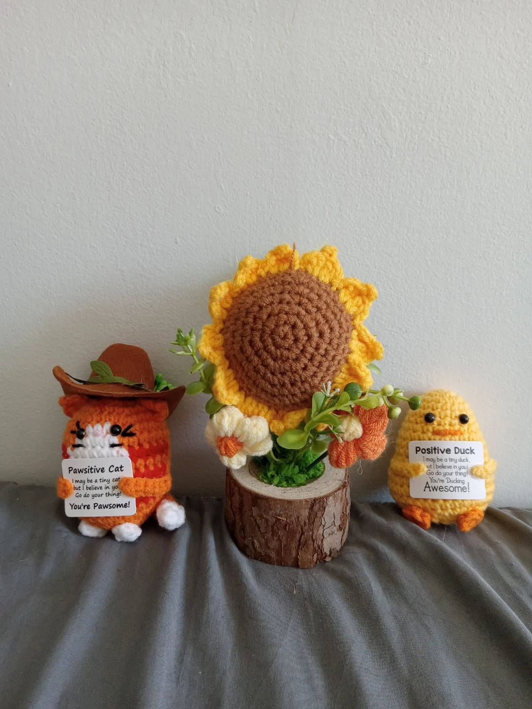 Adorable handmade crochet cat and duck, each with a positive message! Includes a charming sunflower in a wooden pot. They're sure to bring a smile to your face. Great for a desk or shelf decoration!