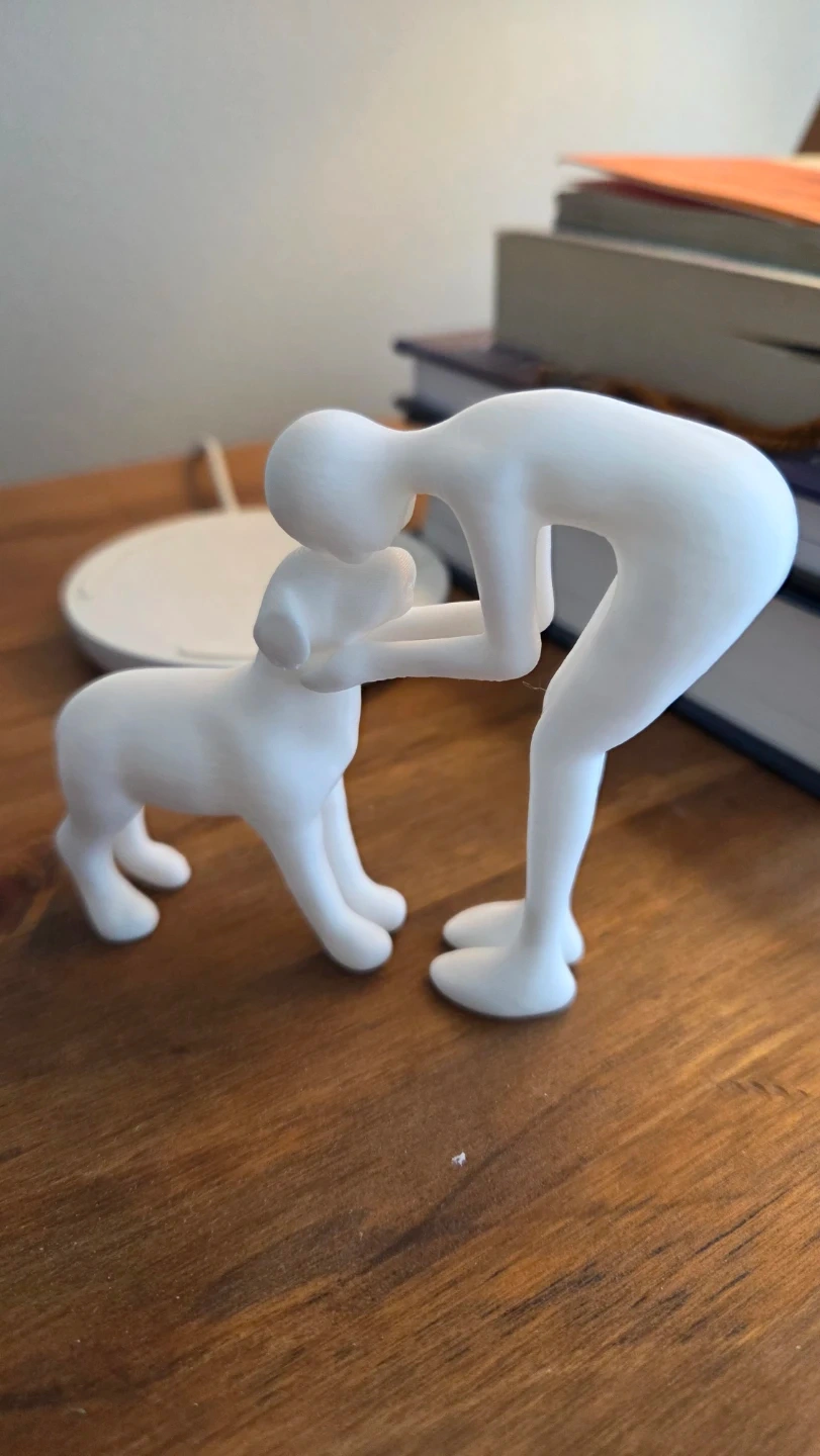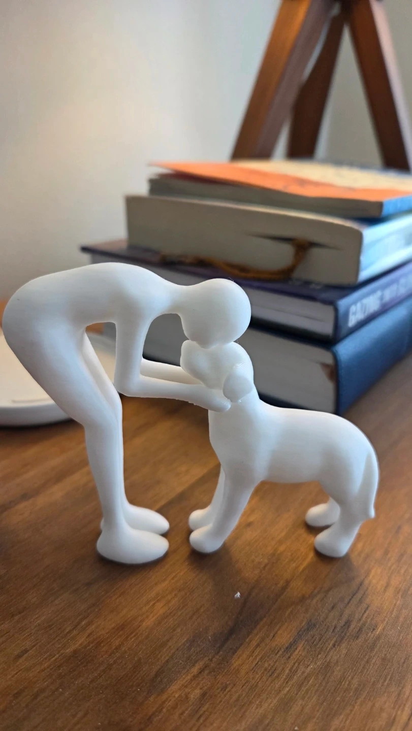 This is a new, white plastic figurine of a person interacting with a dog. It's made of plastic material. The minimalist design would suit simple decor styles. A thoughtful gift for yourself or any dog lover!