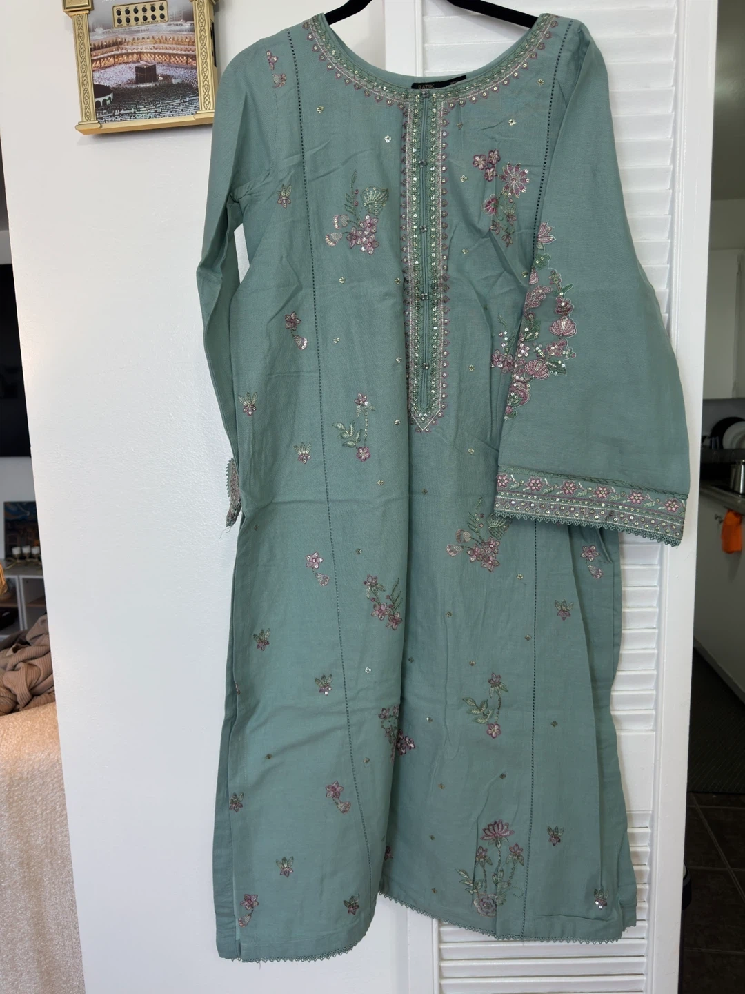 Beautiful teal embroidered khaddar suit with a matching sheer dupatta. Features intricate floral embroidery and sequin details. Perfect for casual wear or events!