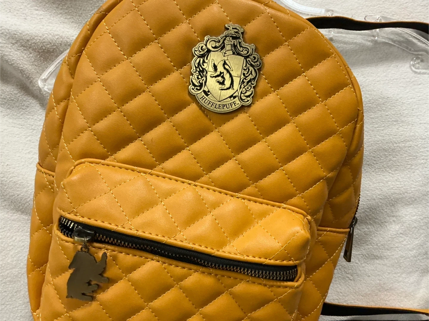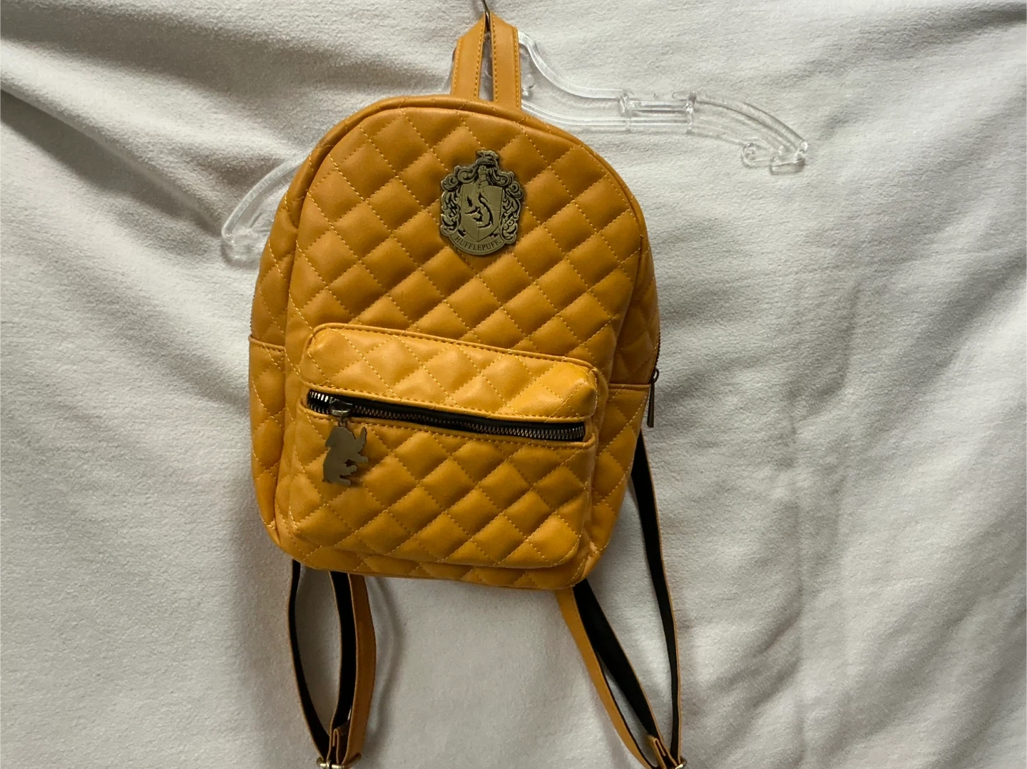 This yellow quilted mini backpack features the Hufflepuff crest. It has a front zipper pocket with a cute charm. It's made of faux leather.
