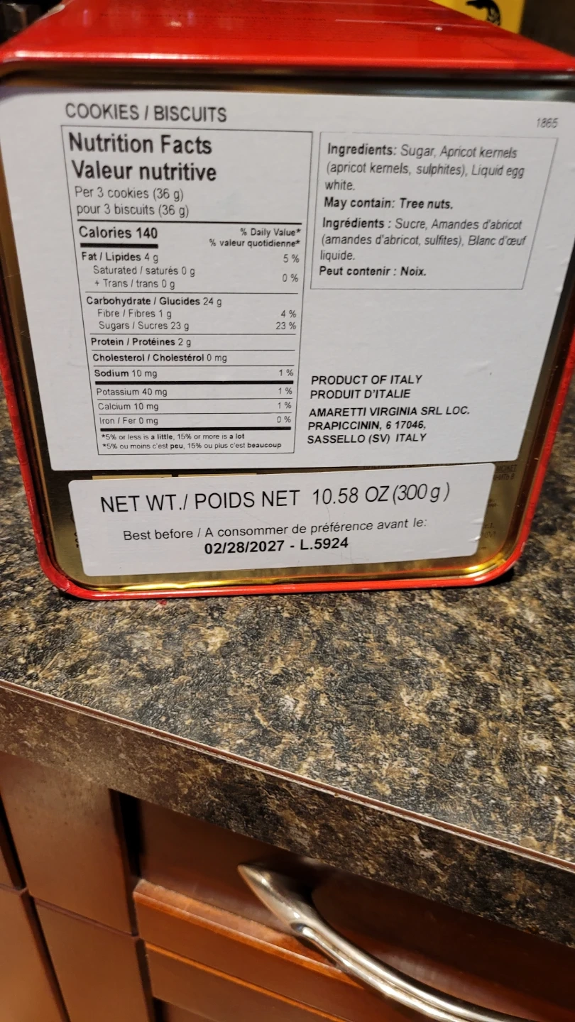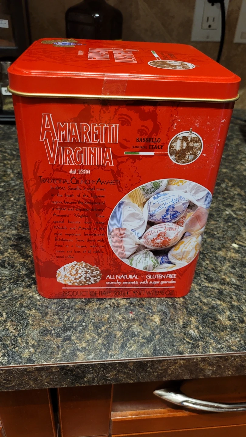 This tin contains Amaretti Virginia traditional crunchy amaretti biscuits from Italy. They are all-natural and gluten-free. Best before 2027-02-28.
