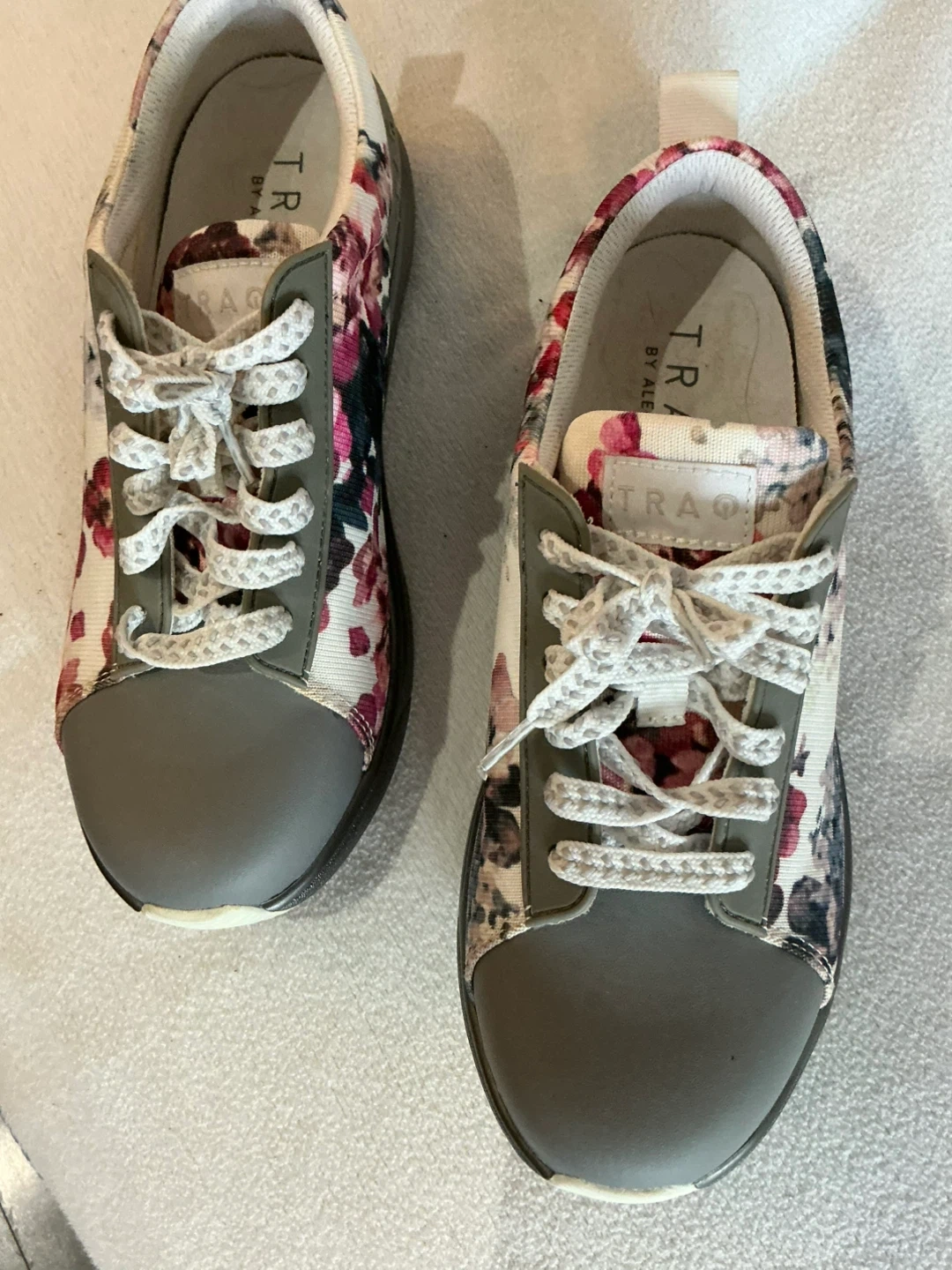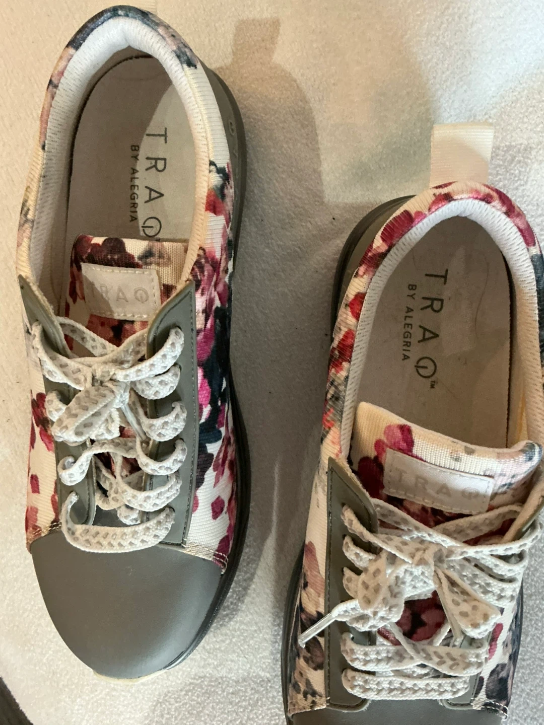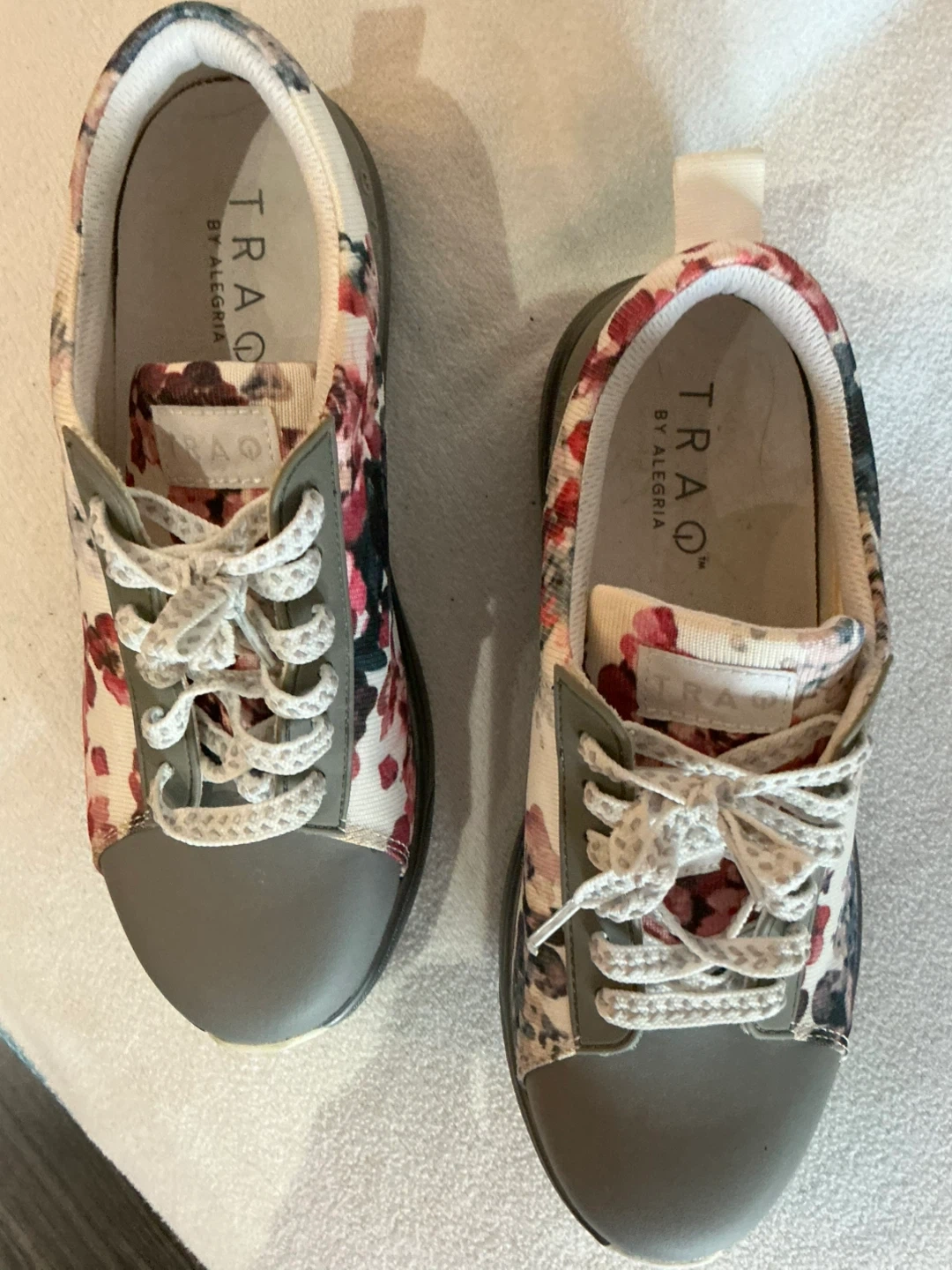 These TRAQ by Alegria sneakers feature a vibrant floral print with a grey toe cap and sole. They have a comfortable, casual design perfect for everyday wear. The shoes are lightweight with lace-up closure.