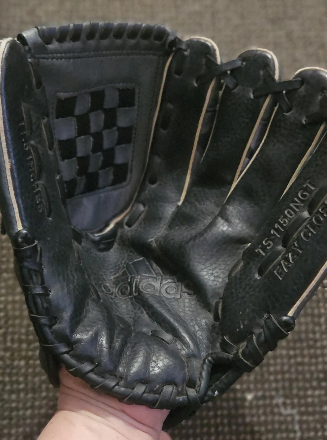 Black Adidas baseball glove with "TS 1150NGT EASY CLOSE" embossed. It's made of leather and has a checkered accent inside. This glove's design makes it easy to close.
