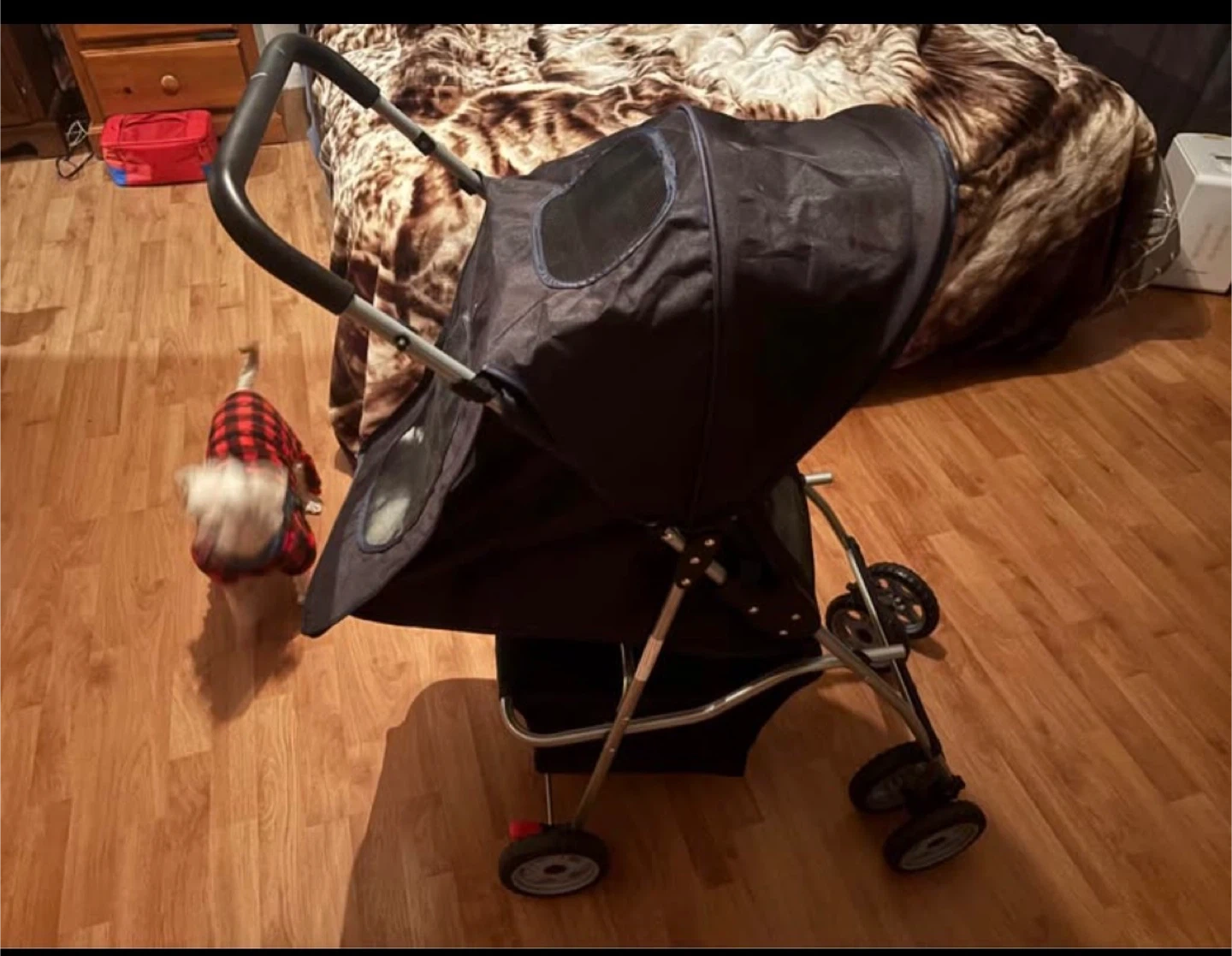 This pet stroller is great for taking your furry friend along. It features mesh windows for ventilation and a comfy interior. Easy to manoeuvre on most surfaces.