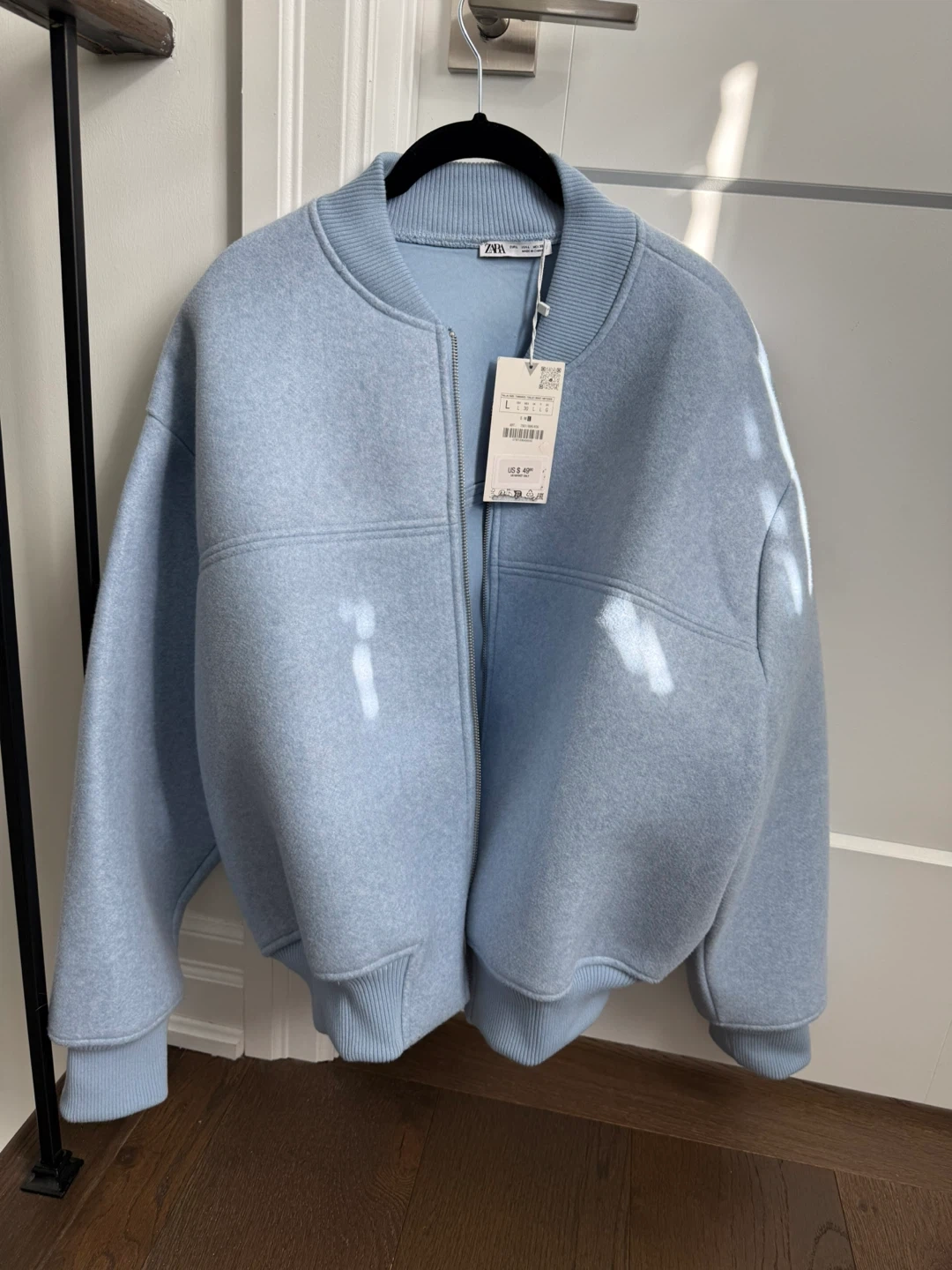 This is a Zara bomber jacket in a light blue colour. It's a size L and has a zip-up front with ribbed cuffs and hem. Made from a soft, brushed fabric.
