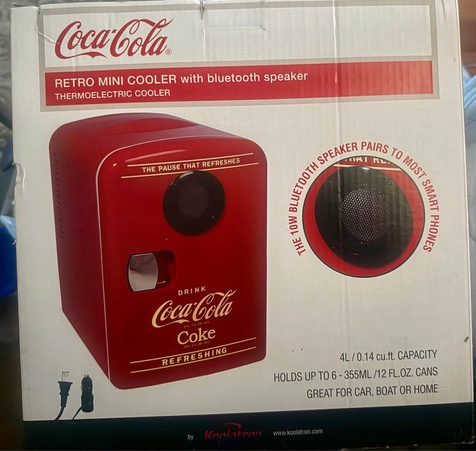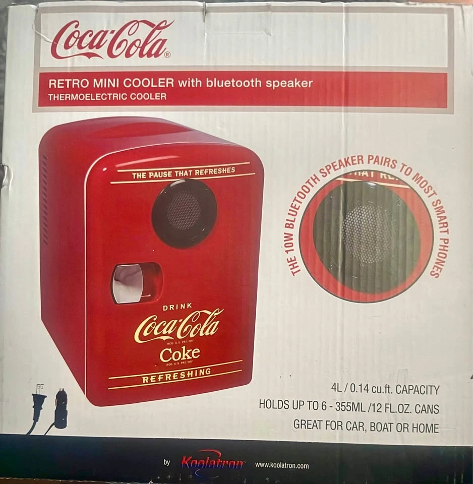 Brand new Coca-Cola 4-liter retro mini fridge/cooler with built-in Bluetooth speaker. Perfect for bedroom, office, dorm, car, boat, or game room. Holds up to 6 x 355 ml (12 oz) cans. Bluetooth speaker pairs with most phones. Thermoelectric cooler (no compressor). Includes original power cables (12V + 110V). Never used and still in original box. Great gift or novelty item.