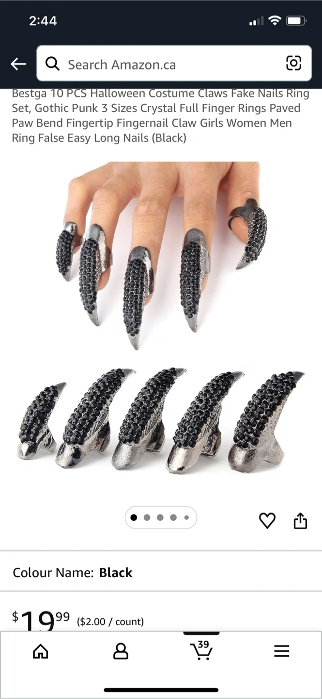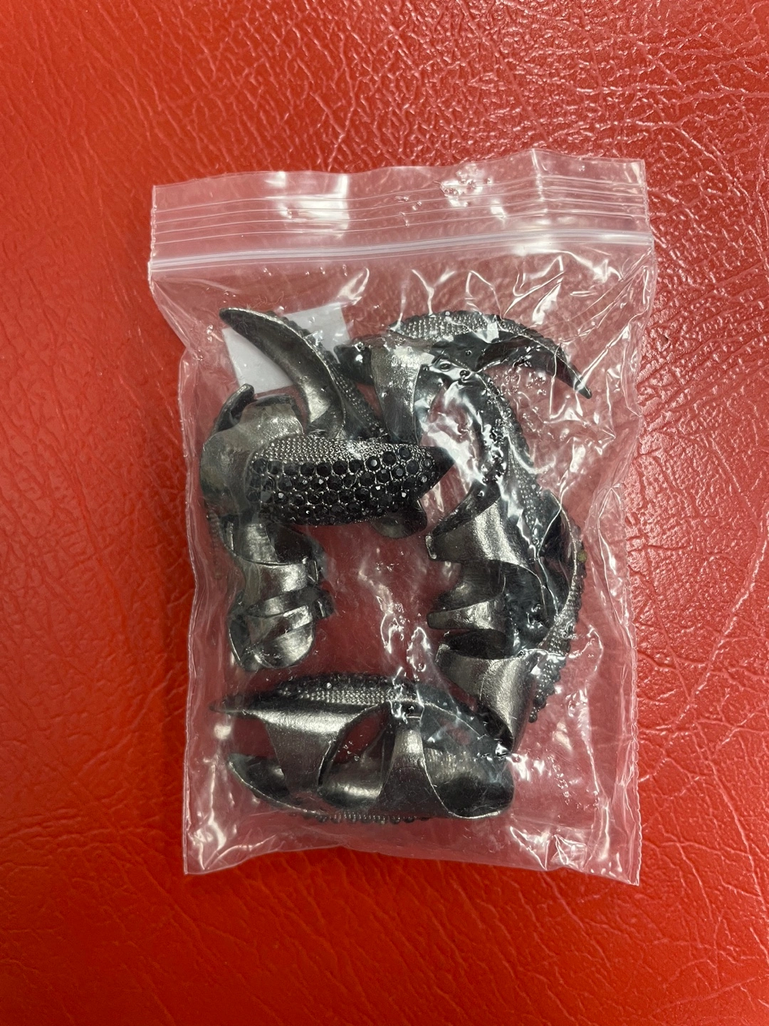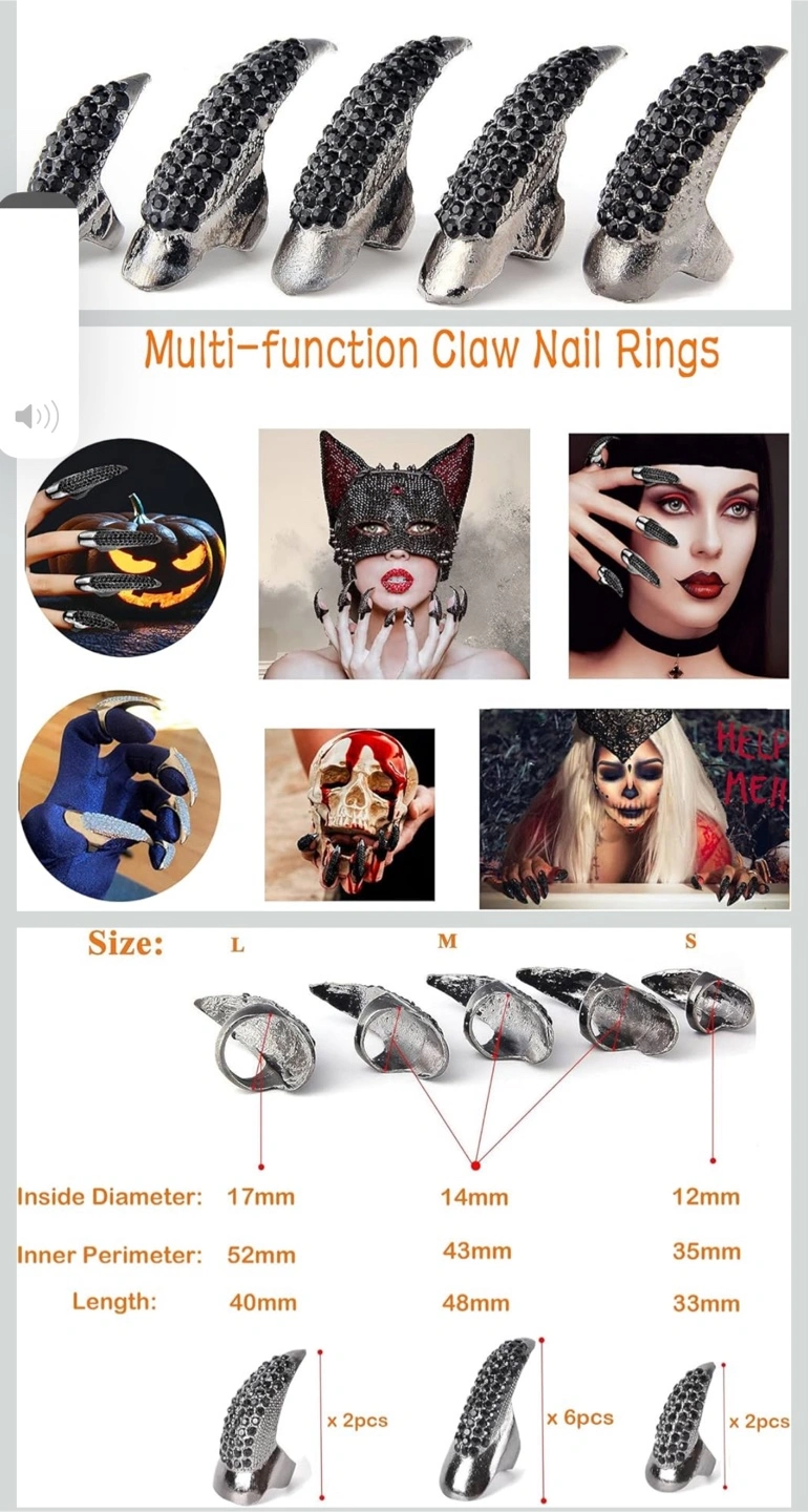 These claw nail rings come in a black, gothic punk style. They're available in three sizes: S, M, and L. This set includes 2 pieces of size L, 6 pieces of size M, and 2 pieces of size S, for a total of 10 rings.