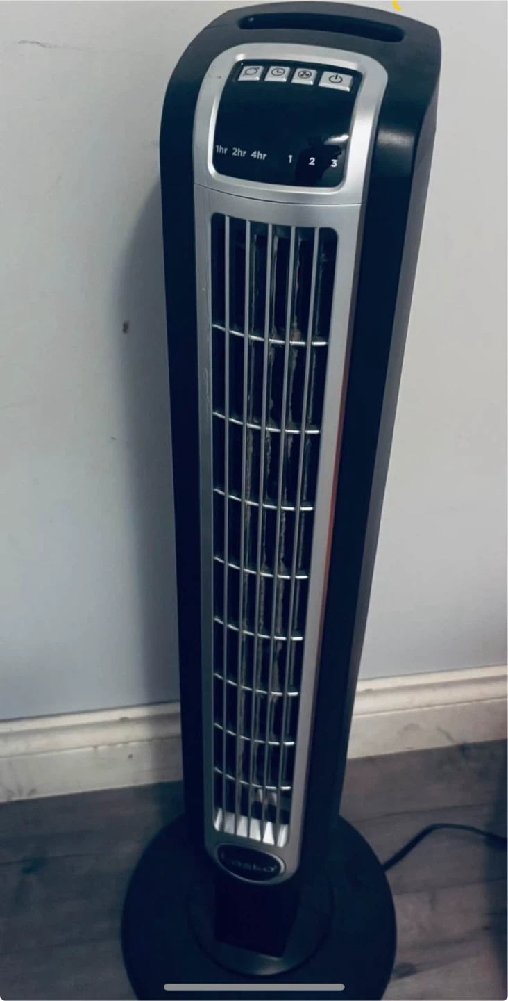 This is a Lasko tower fan with multiple speed settings and a timer function. It's black and silver and would be great for cooling down a room.