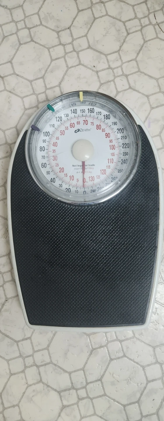 This is a Zenith mechanical scale. It measures up to 300 lbs (136 kg) and has both pound and kilogram readings. It's got a black textured platform.