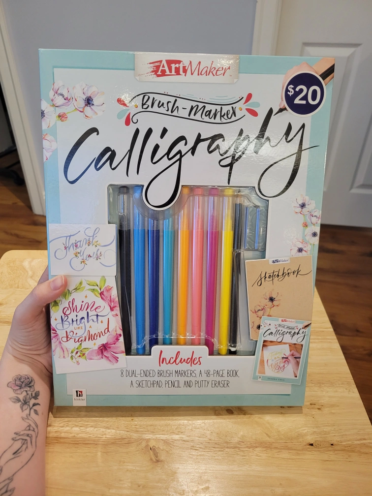 Brand new calligraphy instructional book with brush markers, sketch pad, pencil and putty eraser.
