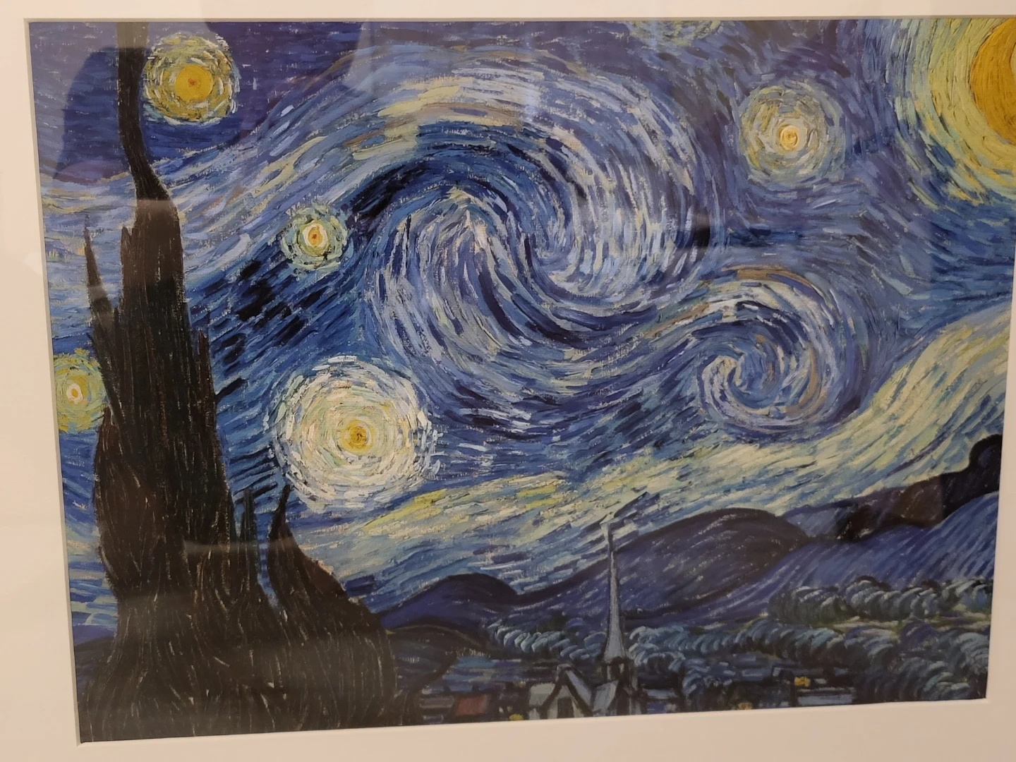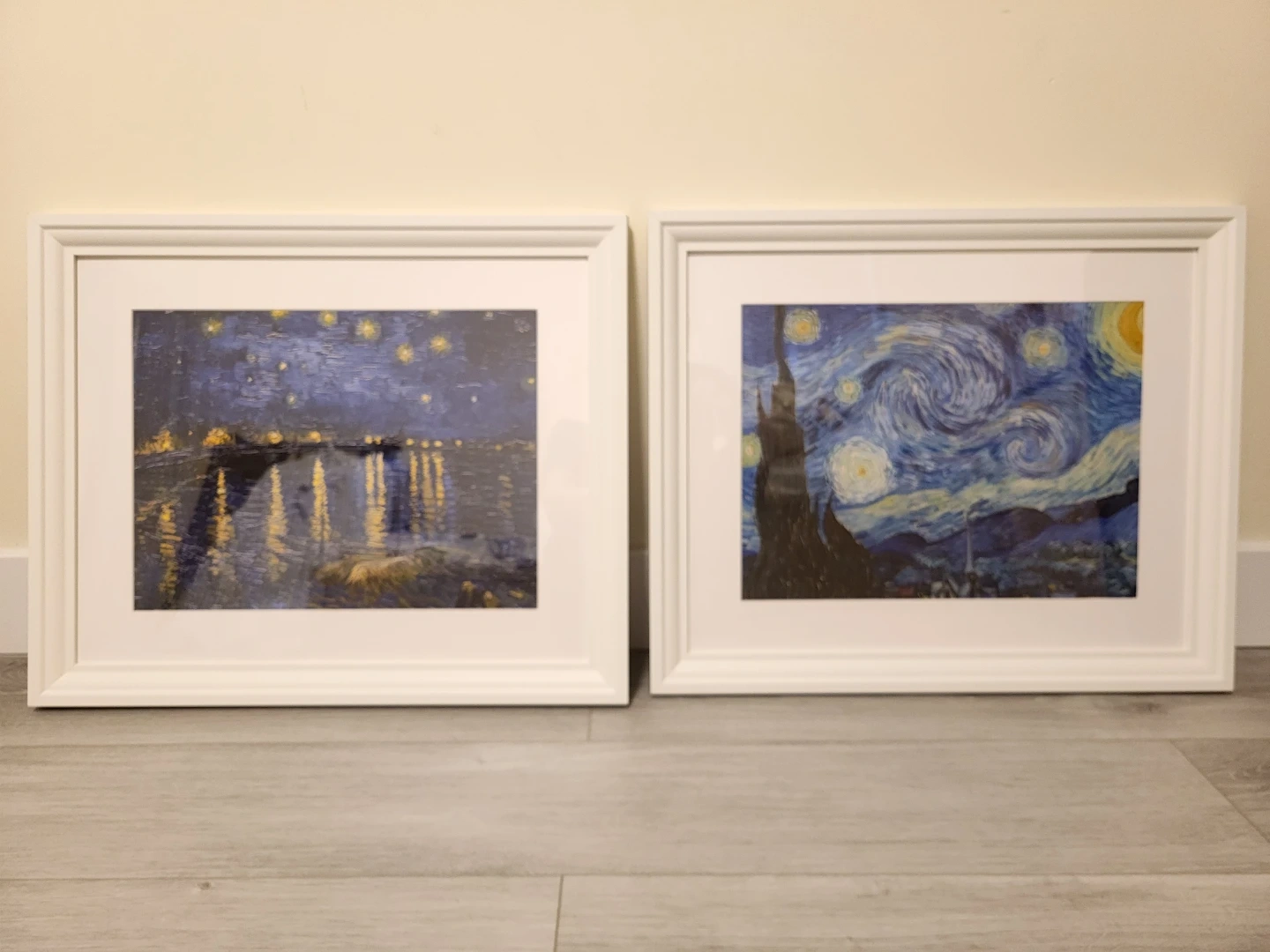 Two framed art prints inspired by Van Gogh's famous works. Includes Starry Night and Starry Night Over the Rhône reproductions. White frames.