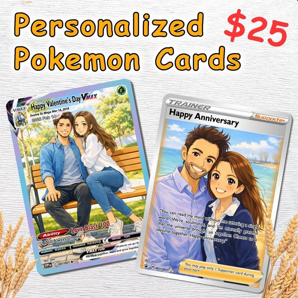 Create a one-of-a-kind custom Pokémon-style card using your own photo or a professionally converted cartoon illustration. A unique, high-quality keepsake designed for collectors, couples, and meaningful gifts. Perfect for Birthday Gifts, Anniversary Gifts, Christmas Gifts, Valentine’s Day, Father’s Day, or as a personalized Pokémon gift.