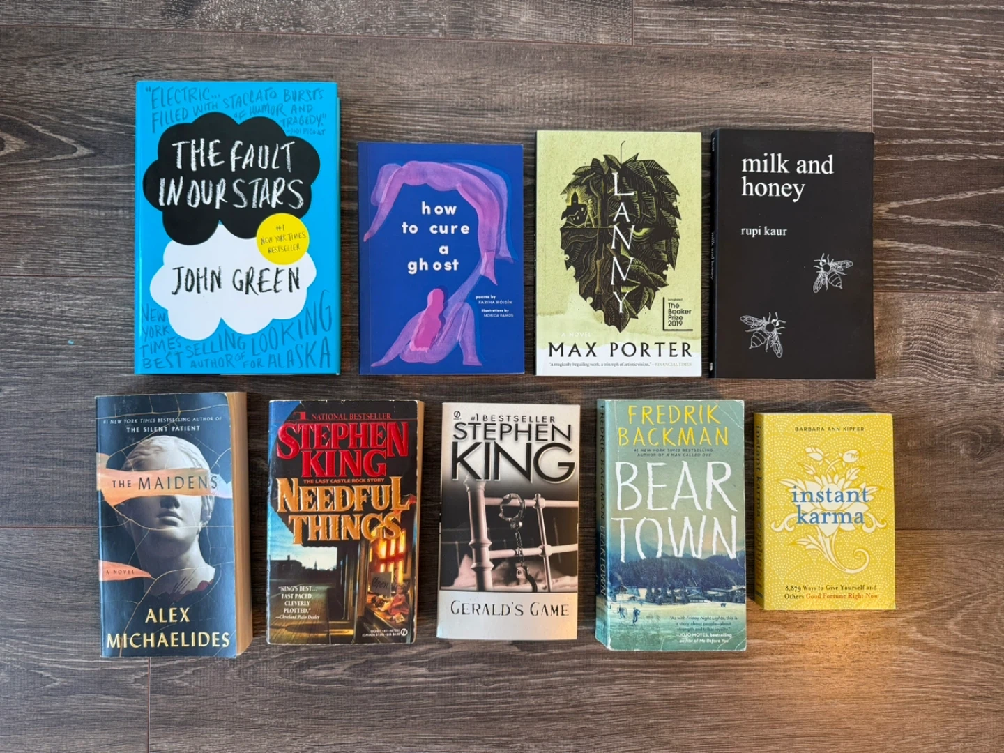 Eight books are included in this lot, featuring popular authors like John Green, Stephen King, Rupi Kaur, Fredrik Backman, and more. Titles include 'The Fault in Our Stars', 'Needful Things', 'Gerald's Game', 'The Maidens', 'how to cure a ghost', 'Lanny', 'milk and honey', and 'Beartown'. Great for any book lover!
