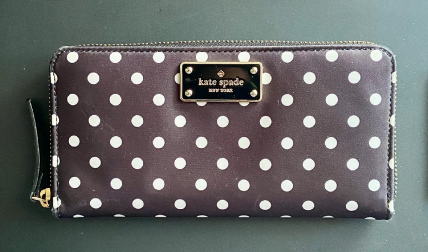 This is a Kate Spade zip-around wallet with a classic black and white polka dot pattern. It features a gold-tone logo plate and a wrist strap. The wallet is made of durable material and offers ample space for cards and cash.