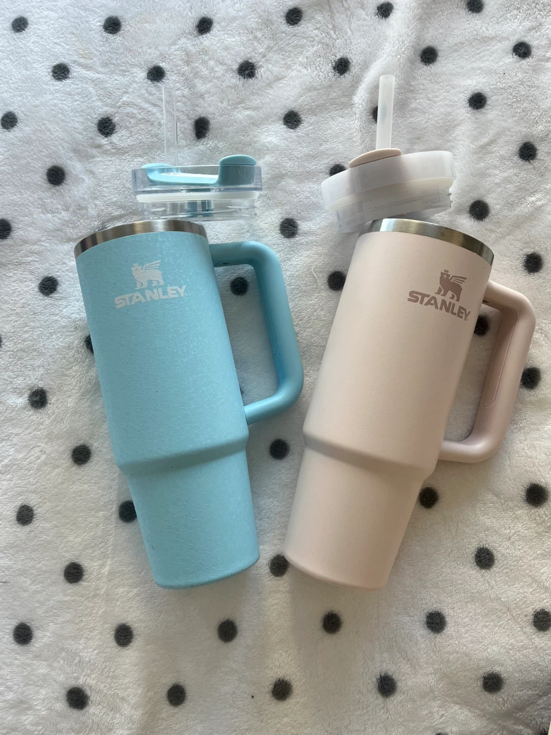 Selling two Stanley tumblers with straws, one light blue and one blush pink. These tumblers are great for keeping your drinks cold or hot. Stainless steel construction. Not used very many times