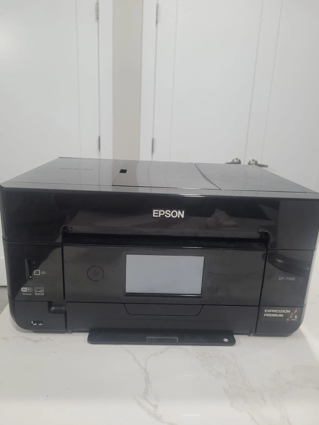 Epson XP-7100 Expression Premium wireless all-in-one inkjet printer. It's a black, glossy finish model. Includes SD card slot, Wi-Fi, and Ethernet connectivity.