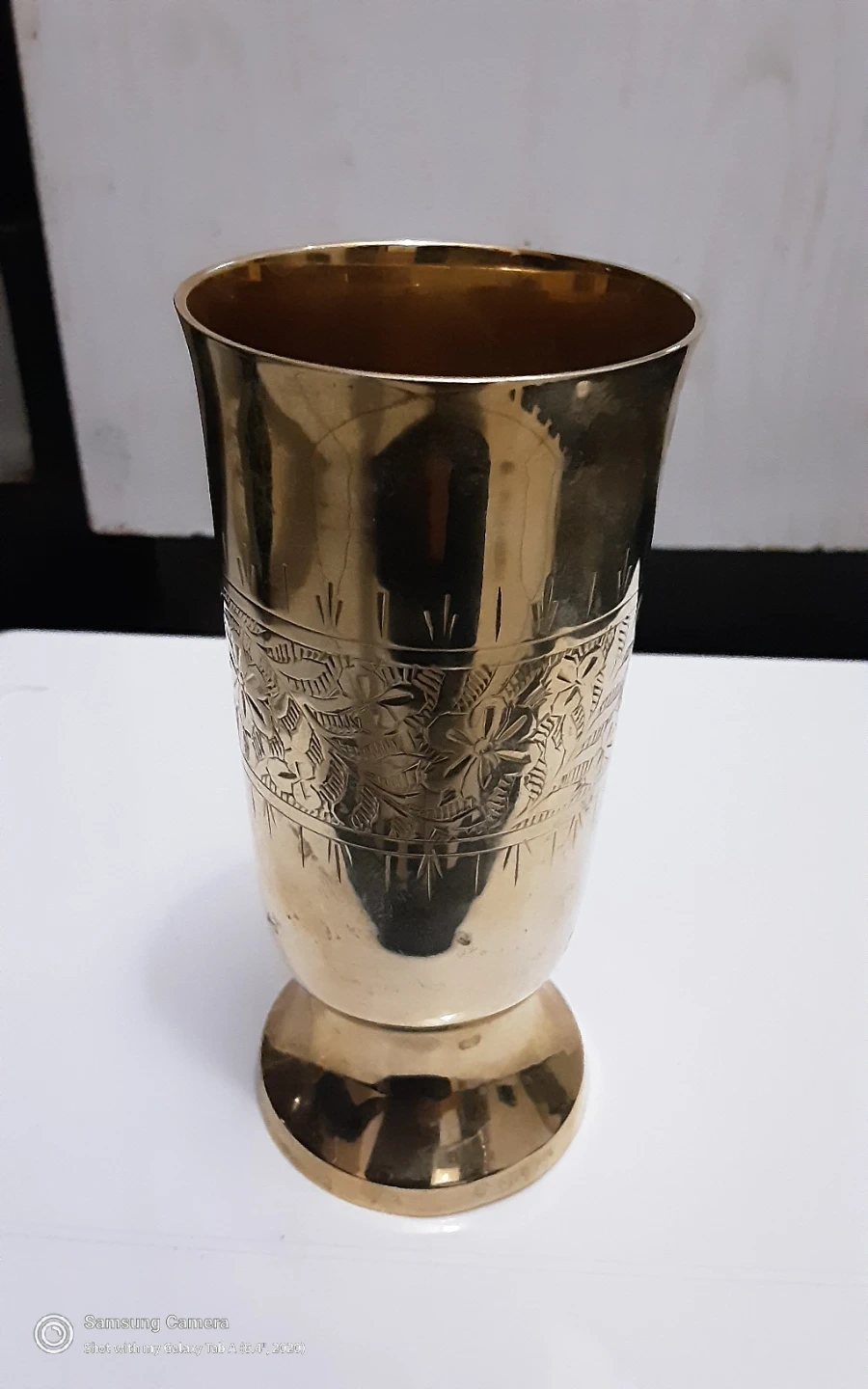 This is a gold-plated goblet made by Atkinson Bros in Sheffield, England. It features an intricate etched floral design around the body. It's a decorative piece, perfect for display.