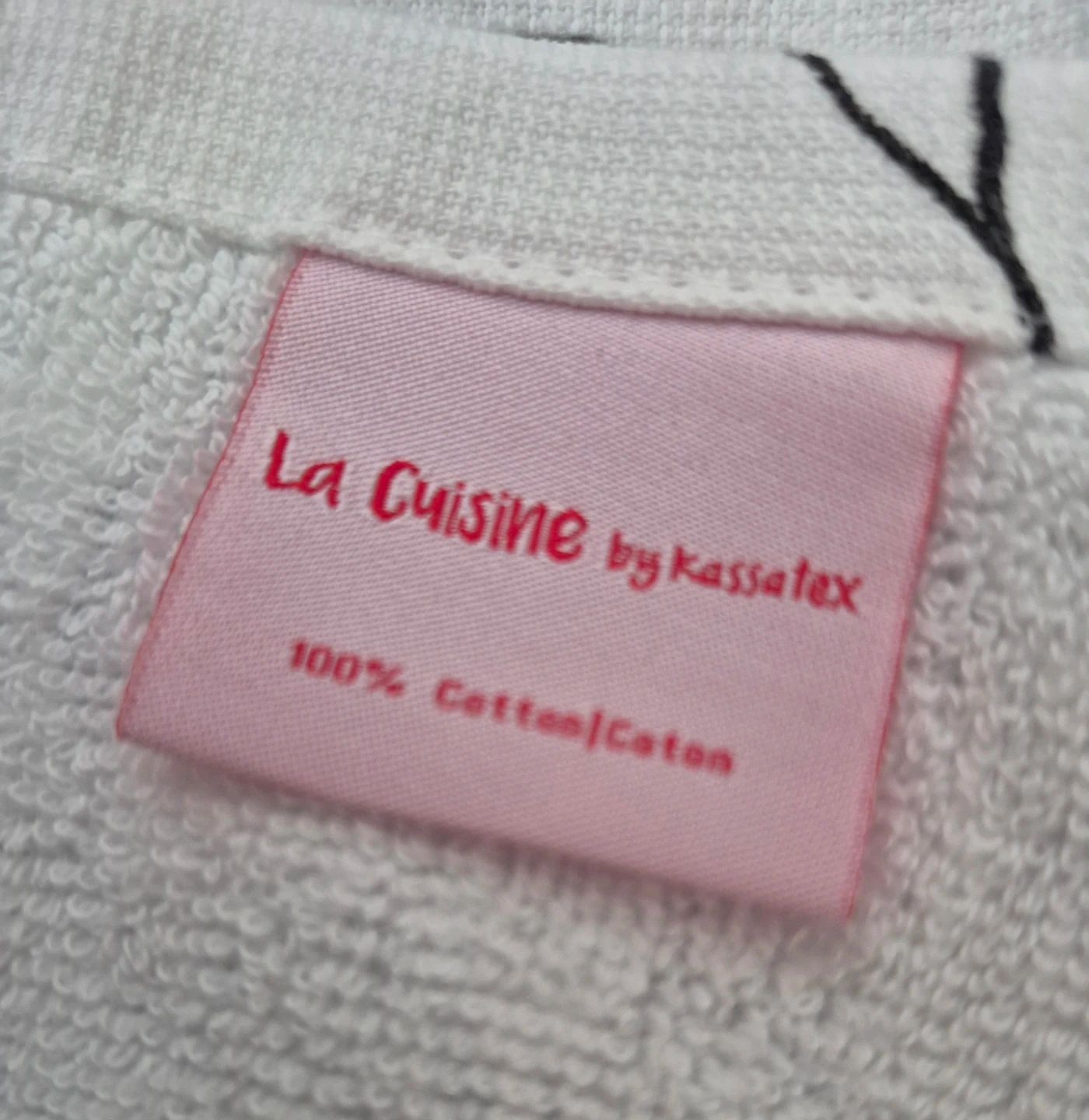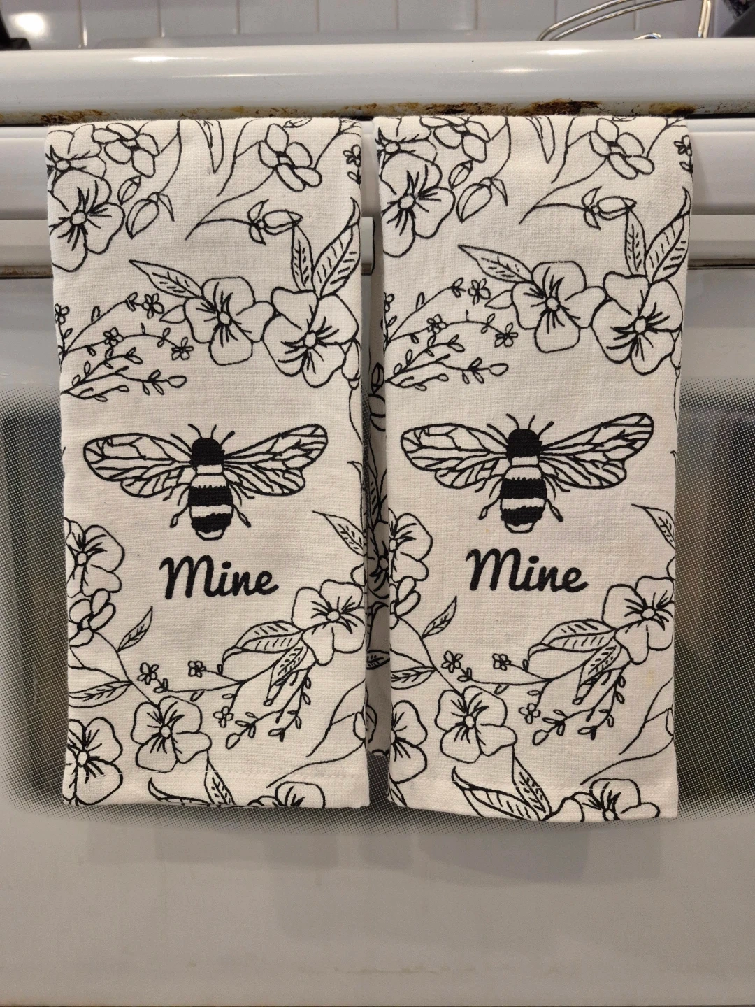 A set of two "Bee Mine" kitchen towels from La Cuisine by Kassatex. They're 100% cotton with a charming bee and floral design. Great for drying dishes or as a decorative accent! Brand new. Cash Only.