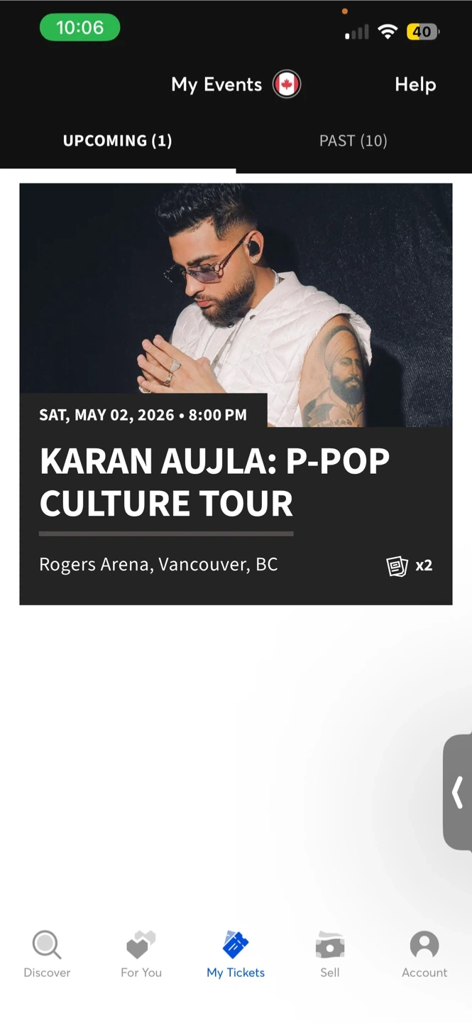 Two tickets for Karan Aujla's P-Pop Culture Tour. The concert is on Saturday, May 2, 2026, at 8:00 PM at Rogers Arena in Vancouver, BC. These tickets would be great for any fan of Karan Aujla!