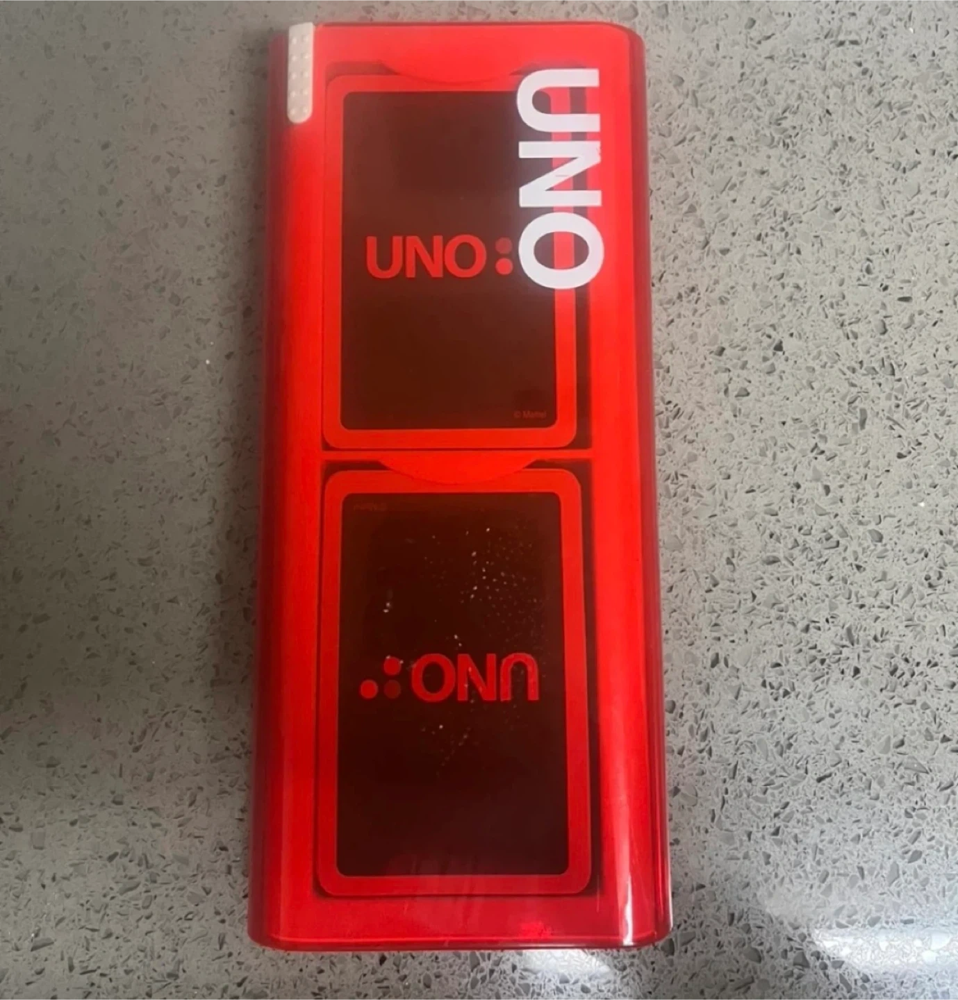 This is a UNO card game in a red case. It's made by Mattel. UNO is a fun card game for families and friends.
