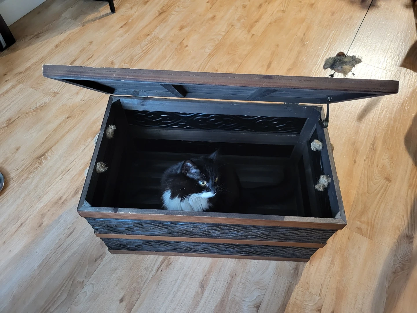This decorative wooden chest box features intricate carved detailing along its sides. It has rope handles for easy carrying. The lid opens to reveal a spacious interior for storage. A great piece for adding a rustic touch to any room! Sorry cat not included