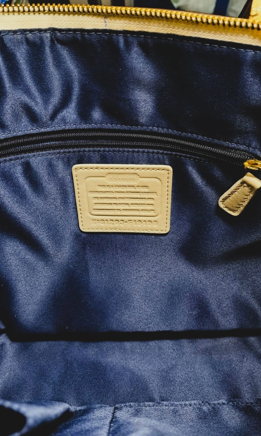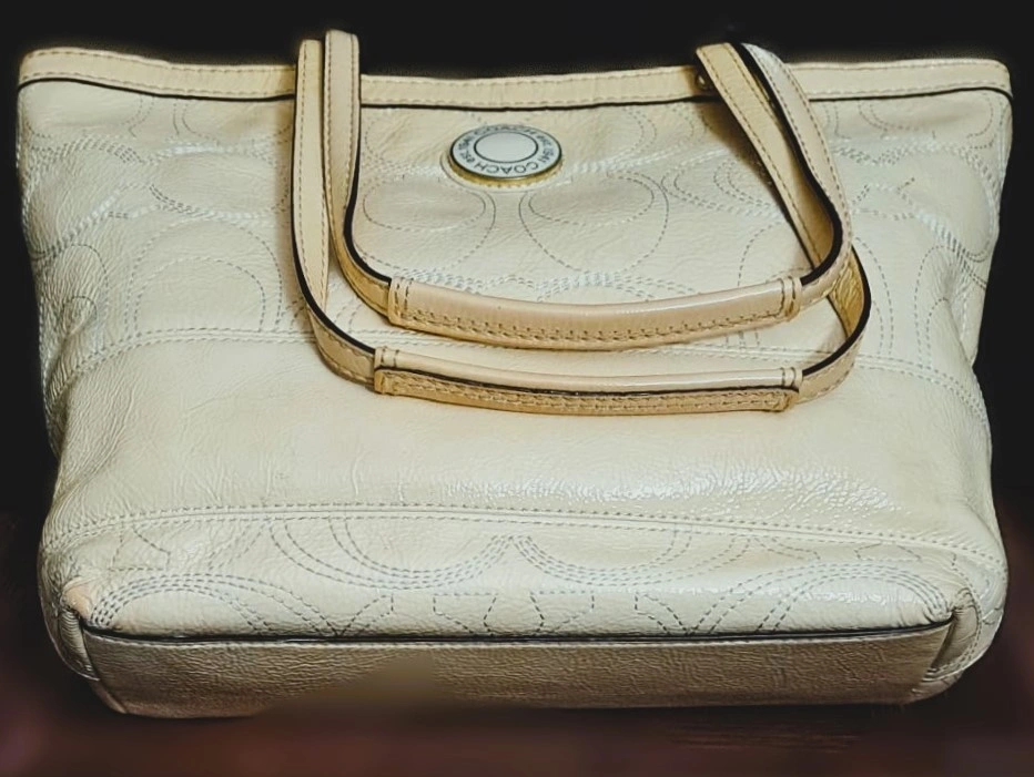 Authentic Coach Signature Stitch Genuine Leather Tote Handbag (F19198). Authentic Coach Signature Stitch Genuine Leather Tote Handbag (F19198). This beautiful and authentic Coach tote features the brand's iconic signature "C" pattern subtly embossed in glossy patent leather. The perfect everyday bag, combining classic style with durable material. Original price $328