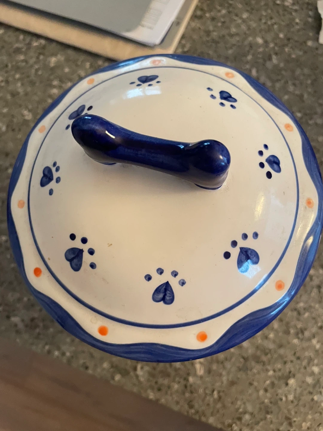 White ceramic canister decorated with blue bone accents and paw prints. It has a lid with a bone-shaped handle. This jar is perfect for storing dog treats or biscuits!