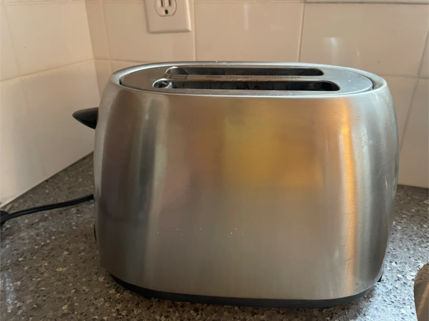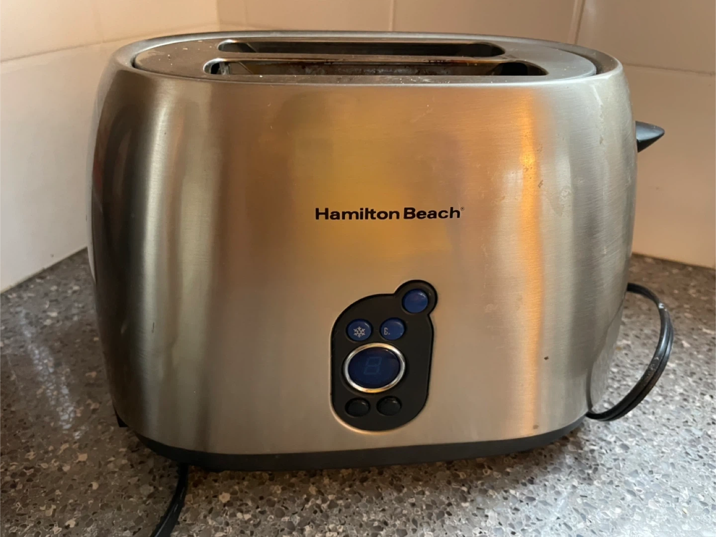 This Hamilton Beach toaster features a stainless steel finish and a fabric toaster cover. It has dual slots and controls for browning. Great for making toast or bagels in the morning!