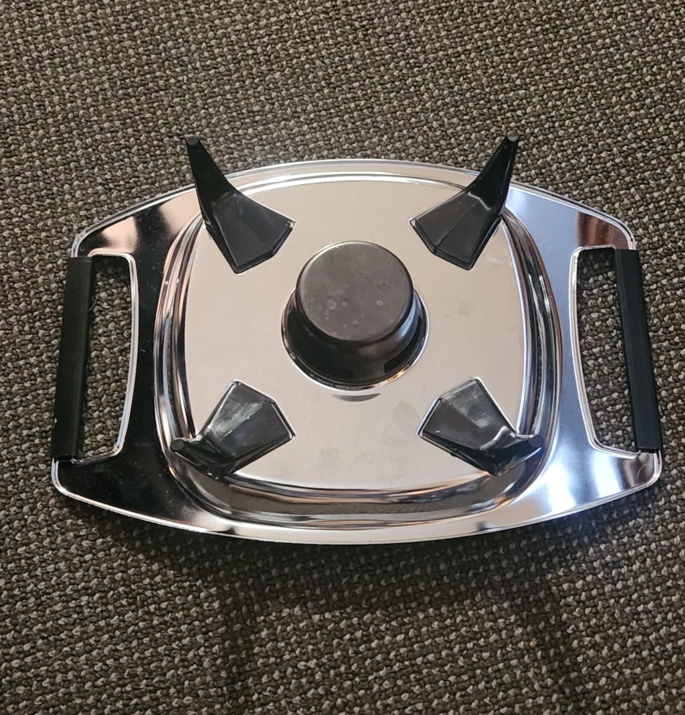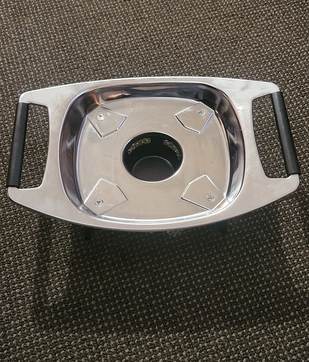 This vintage food warmer stand is made of silverplate with black handles. It's designed to hold a Sterno can for keeping food warm. Great for buffets or special occasions!