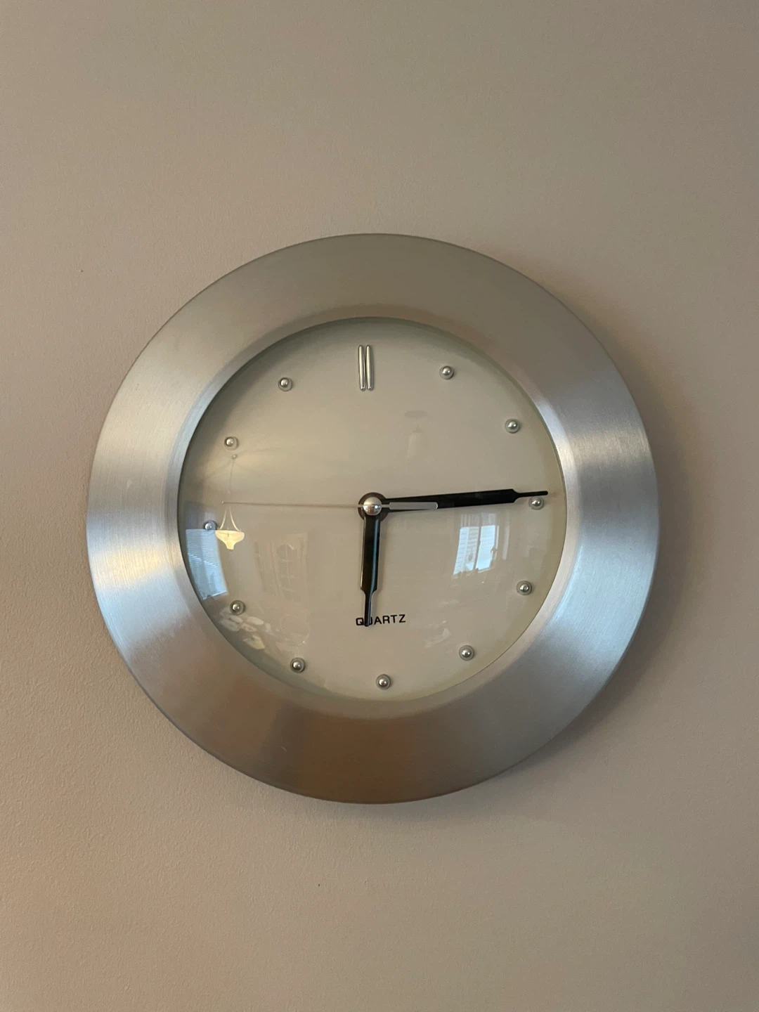 This Daniel Dakota wall clock features a sleek metal frame and a white face with clear hour markers. It runs on a quartz movement for accurate timekeeping. The back indicates the brand and includes a website for more info. It's battery operated.