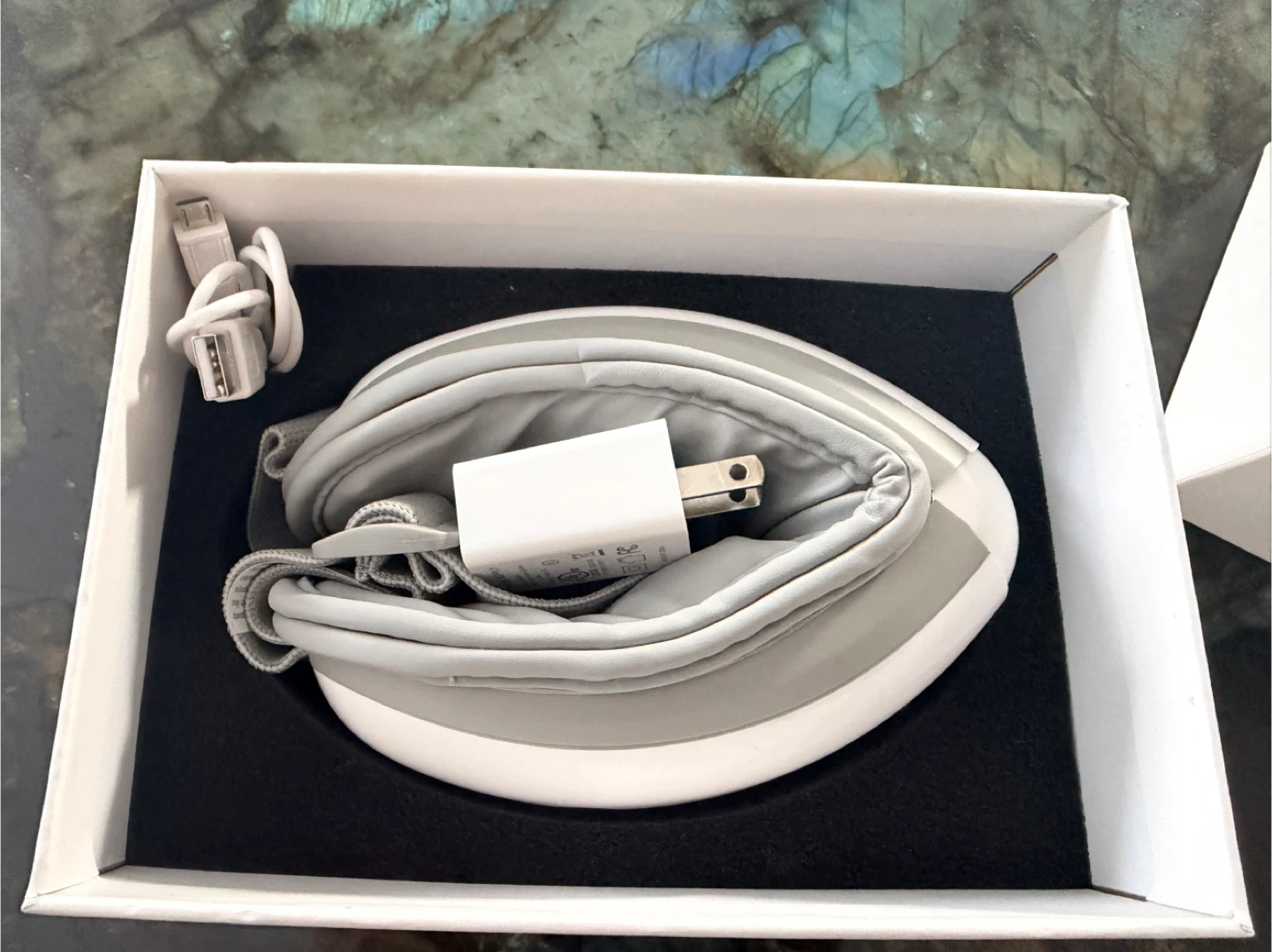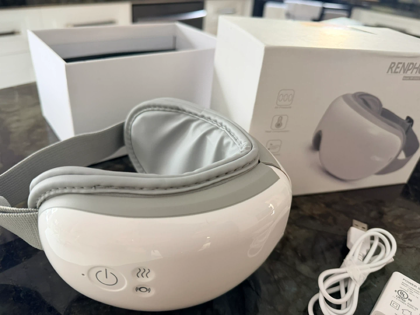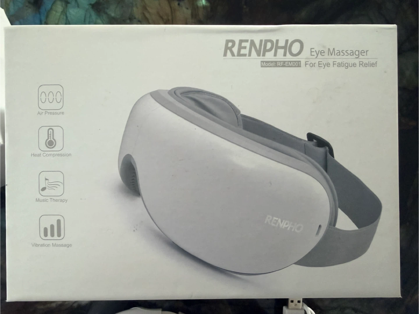 RENPHO eye massager with air pressure, heat compression, music therapy, and vibration massage. Includes charger and original box. Helps relieve eye fatigue.