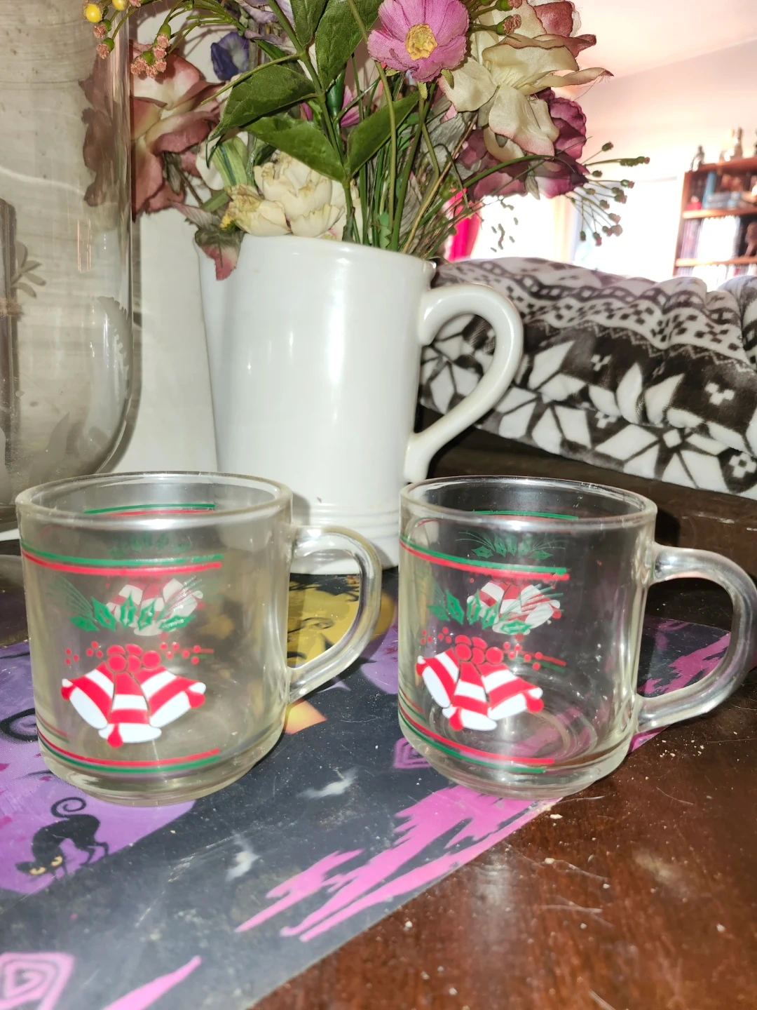 clear glass mugs. Two have a frosted floral design and two have a festive bell and ribbon design with red and green accents. They're perfect for serving small hot beverages like espresso or tea.