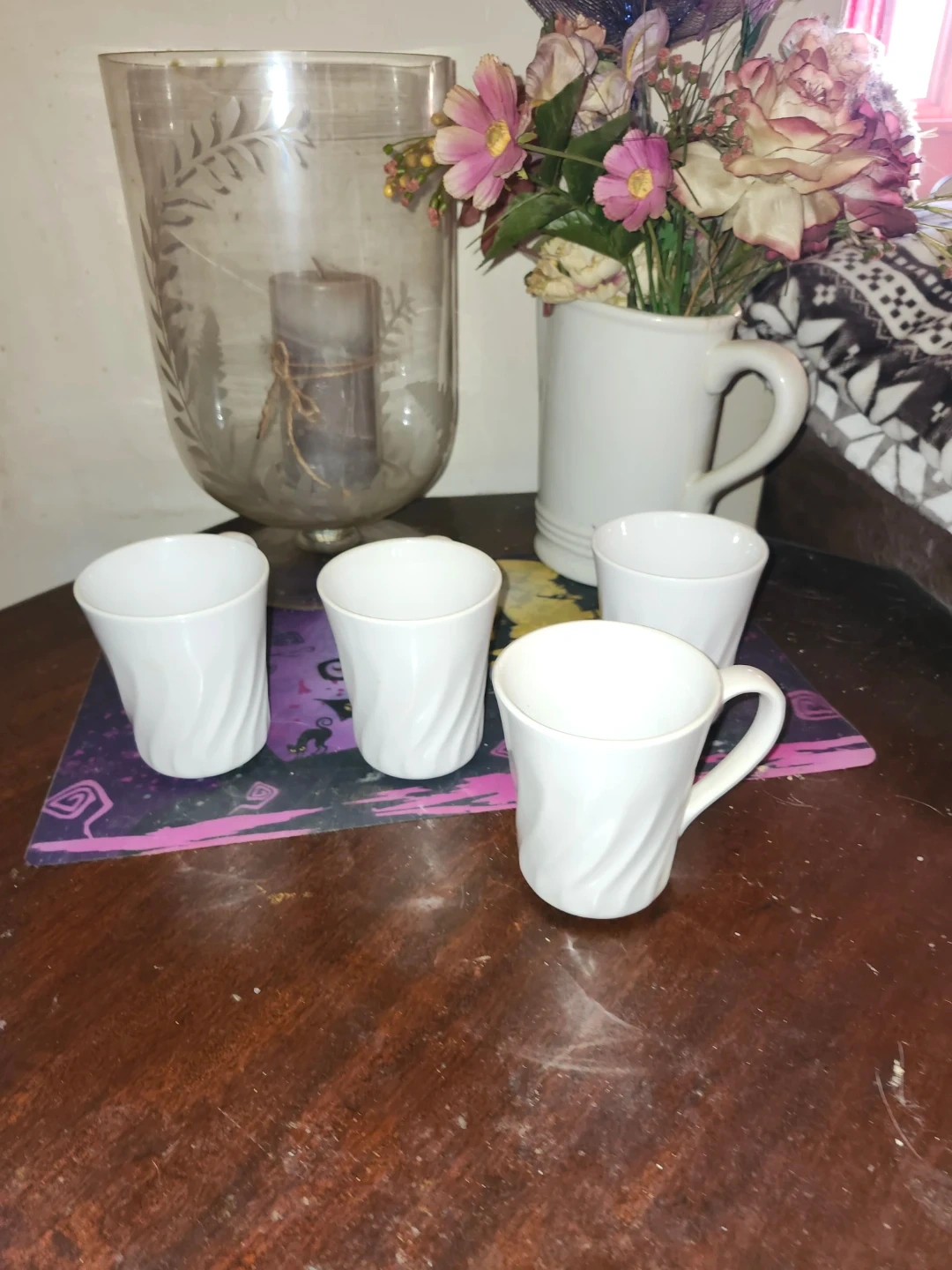 Set of four white stoneware mugs from Corelle Coordinates. Dishwasher safe. These mugs are sturdy and ready for your morning coffee or tea!