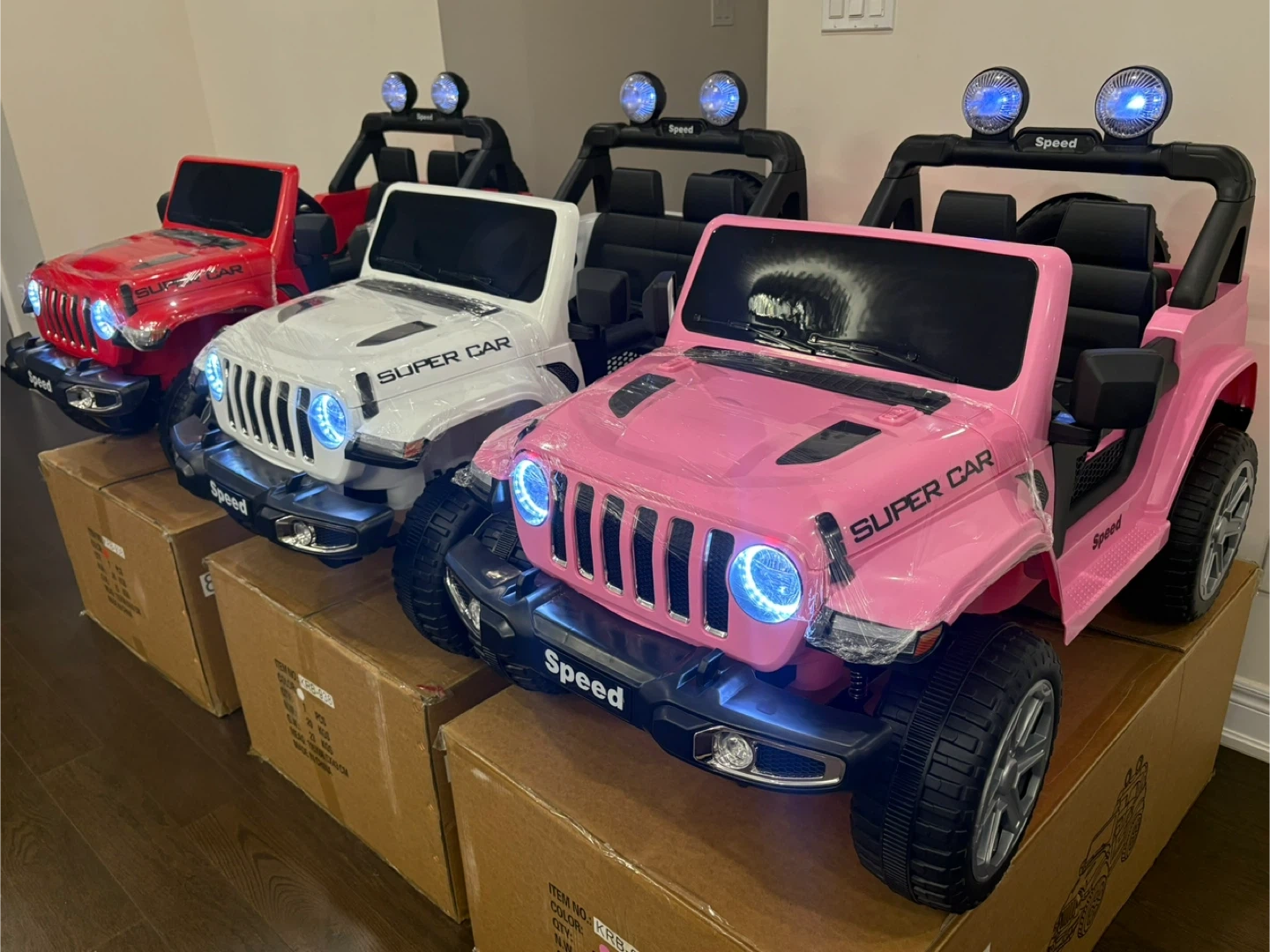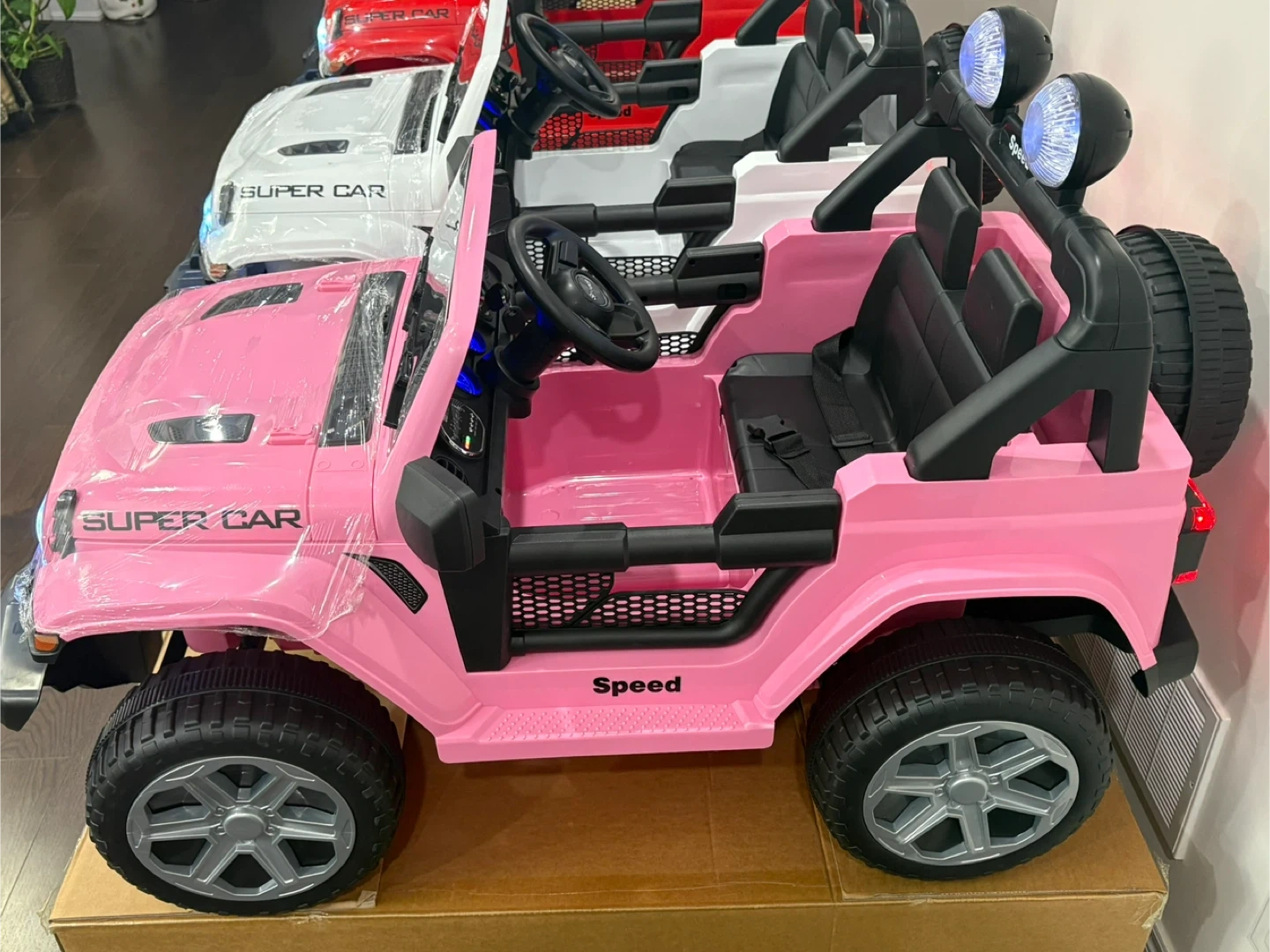This electric ride-on car is a fantastic toy for kids. It has a super car design and is available in red, white, or pink. Lights and sounds add to the fun driving experience. Suitable for young adventurers! , 12 v battery , build in speaker and usb port to play your own music , suspensions , key to start