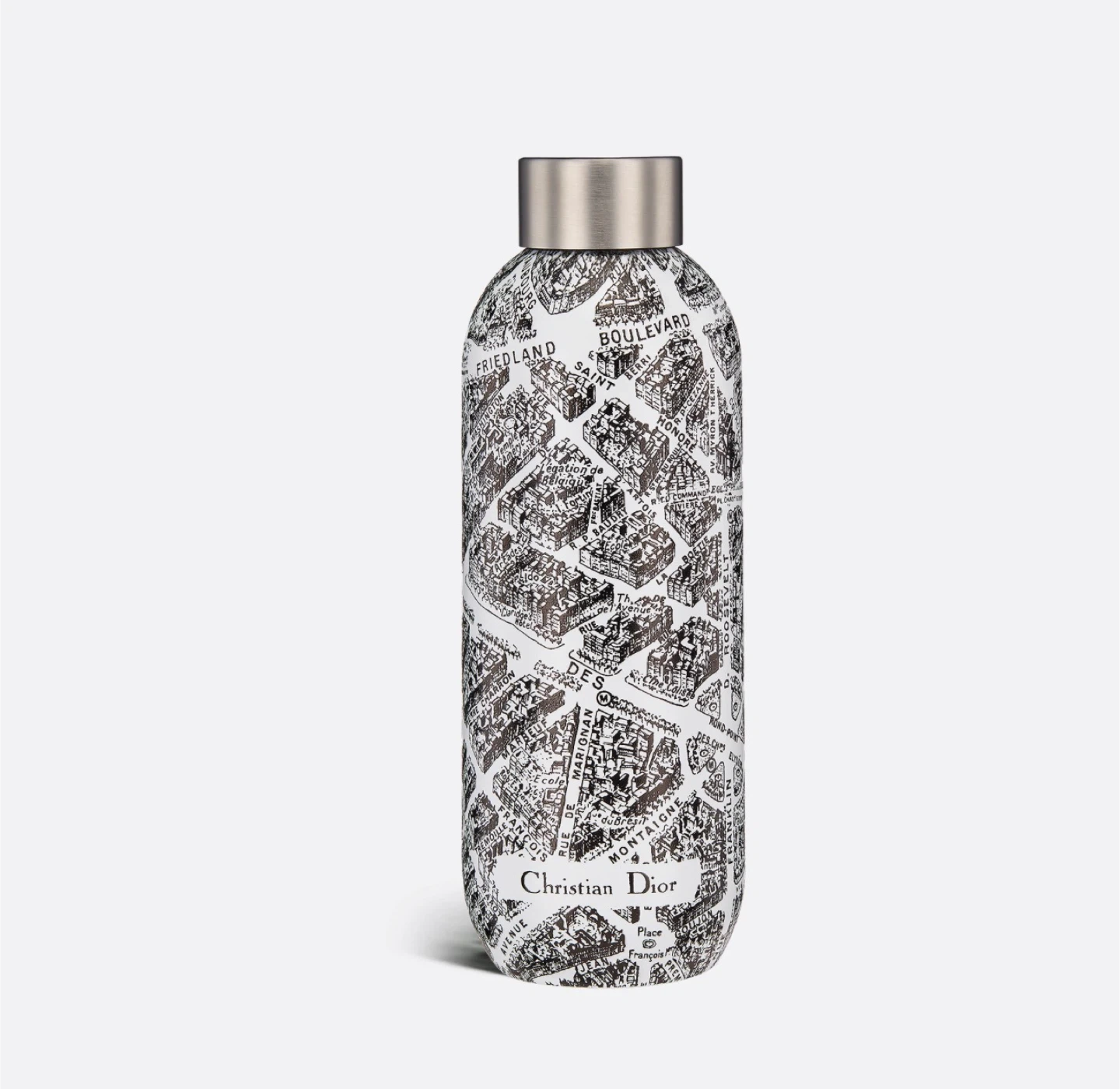 Dior Maison showcases the Plan de Paris line in celebration of the streets of Paris: from Faubourg-Saint-Honoré This is a Christian Dior Plan de Paris stainless steel water bottle.