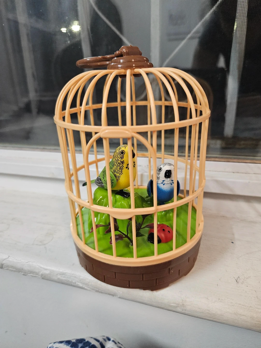 This is a fun toy bird cage with two colorful budgies inside. It also includes a little ladybug on the green base. The cage is made of plastic and has a latch on top.and birds make a voice too.it says "hello I love you"